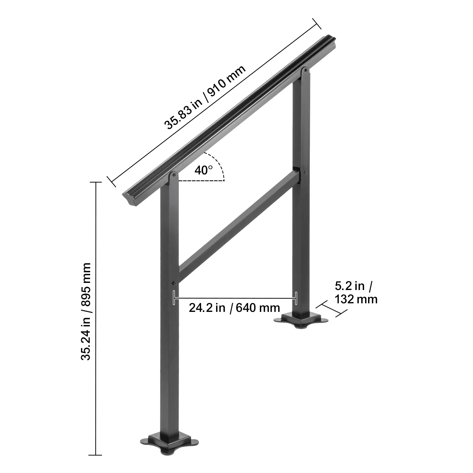 • Adjustable for 2-3 Steps: Product Size (W x H): 35.8" x 35.2"/91 x 89.5 cm; Distance Between Vertical Bars: 25.2"/64 cm. Due to the 0-30° adjustable angle, our handrail for outdoor steps fits your 2 to 3 steps. It is perfect for helping people keep balance when walking up and down the stairs in the rain or winter.