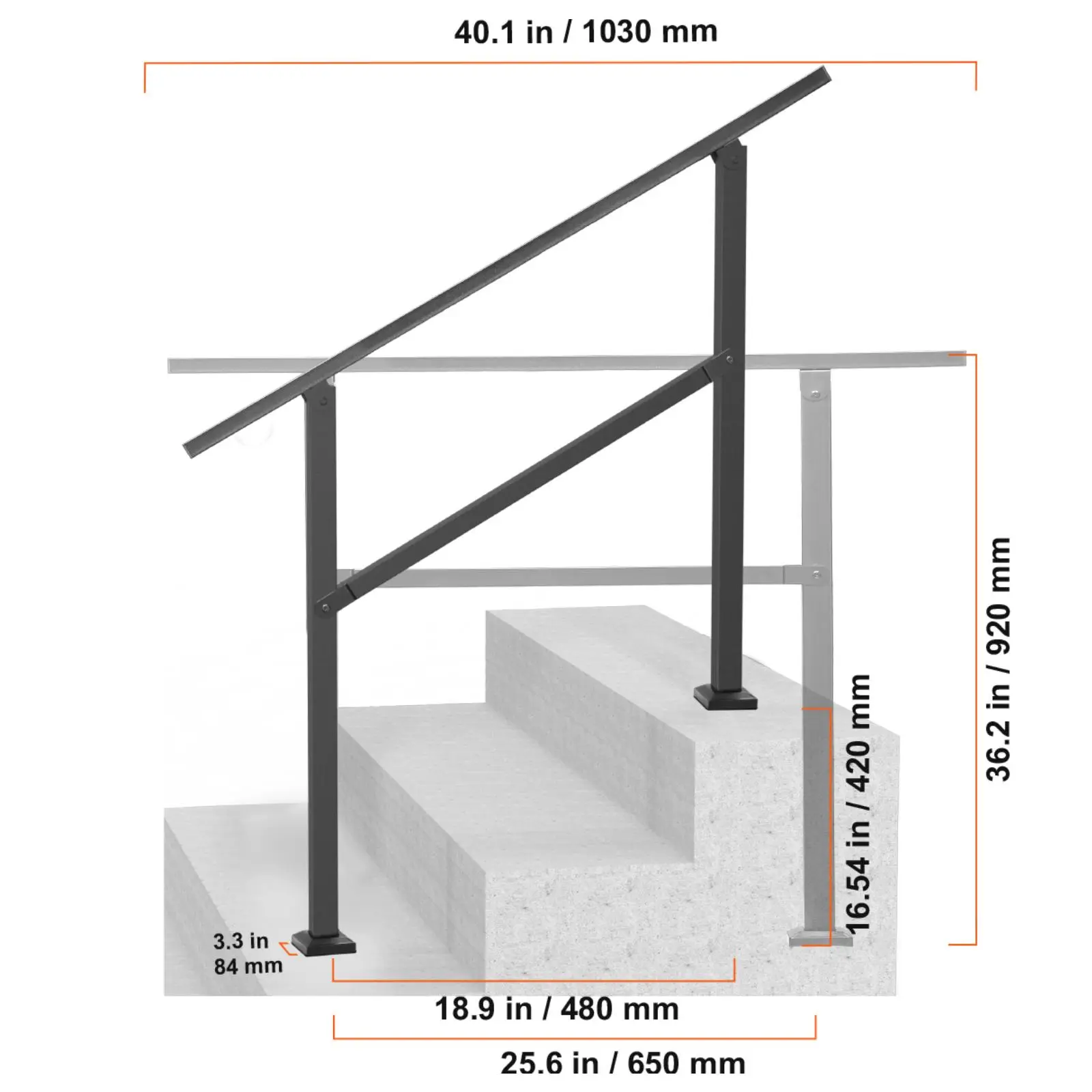 • Fits 2-3 Steps: Our handrail is suitable for 2-3 step transitions, with an adjustable angle range of 0 to 40 degrees, perfect for most door steps, garage entrances, and garden railings