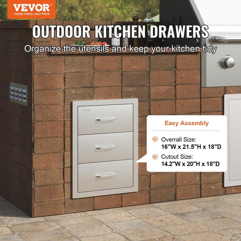 • 3-Tier Kitchen Drawers: Overall Size: 16"W x 21.5"H x 18"D. Cutout Size: 14.2"W x 20"H x 18"D. Our kitchen drawer is simple to assemble and provides spacious storage space for you to keep everything organized. You will have a clean and neat kitchen.