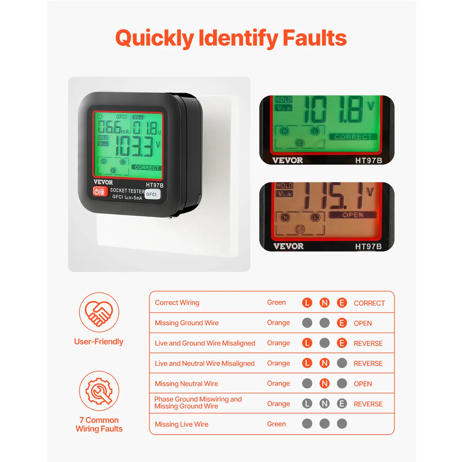 • Quickly Identify Wiring Faults: With the VEVOR outlet tester, you can quickly identify 7 common wiring faults. It can detect issues such as missing ground wires, reversed live and neutral wires, missing neutral wires, and more, helping you efficiently troubleshoot electrical issues and prevent potential hazards.