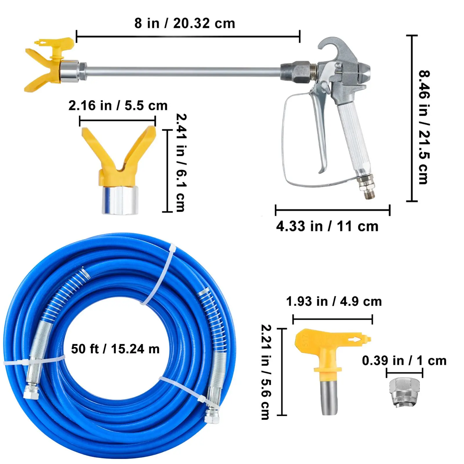 • Airless Spray Accessory Kit: VEVOR's Paint Kit makes the surface coating preparation easier and faster. It supports most mainstream airless sprayer brands, widely applied in home decoration, painting, and industrial fine paint decoration. The package includes a 50 ft airless paint hose, an airless spray device, a tip guide with a 517 tip, and an 8 in extension pole.