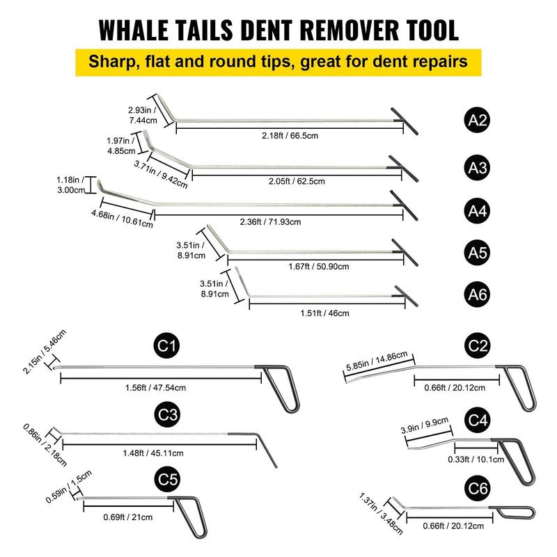 ·21pcs Dent Removal Rods: Includes 21 PCS dent removal rods of different sizes (A2-A6, B2-B11, C1-C6). This rod set belongs to long-style rods with different shapes of tips. The length range is 0.72 ft to 2.69 ft. Especially suitable for car dents in the deep where our hands are inaccessible.