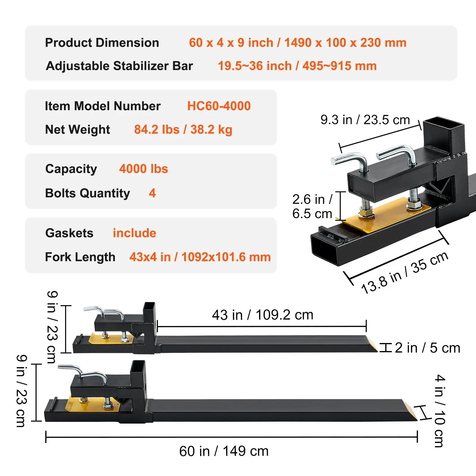 • Product Dimensions: This pallet fork for tractor and bucket measures 60" overall length, with a 43" fork blade. The blade has a height of 2" and a width of 2.75". The gap between the lip of the bucket and the blade is 2.95". Each package contains 2 x Pallet forks and 1 x user manual.
