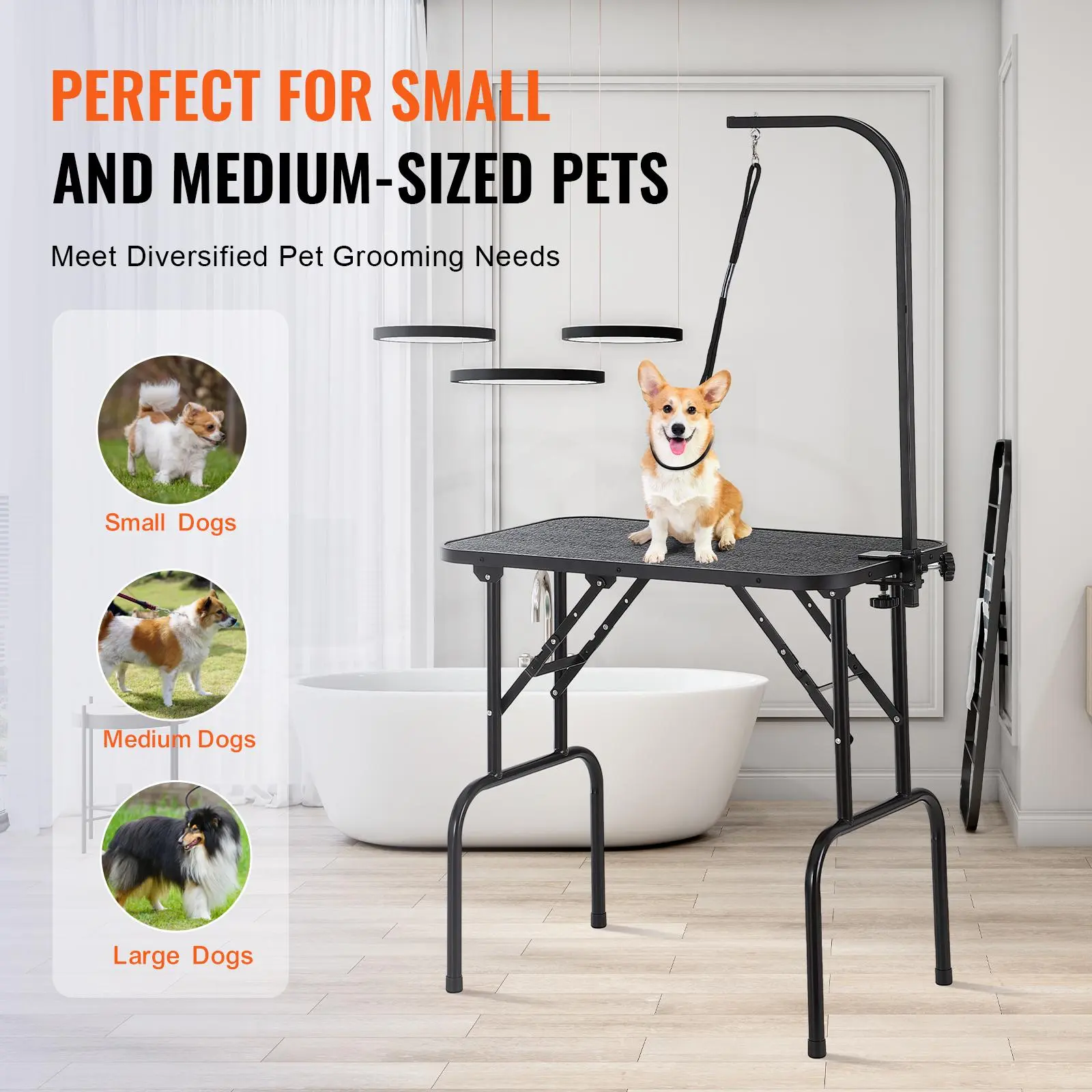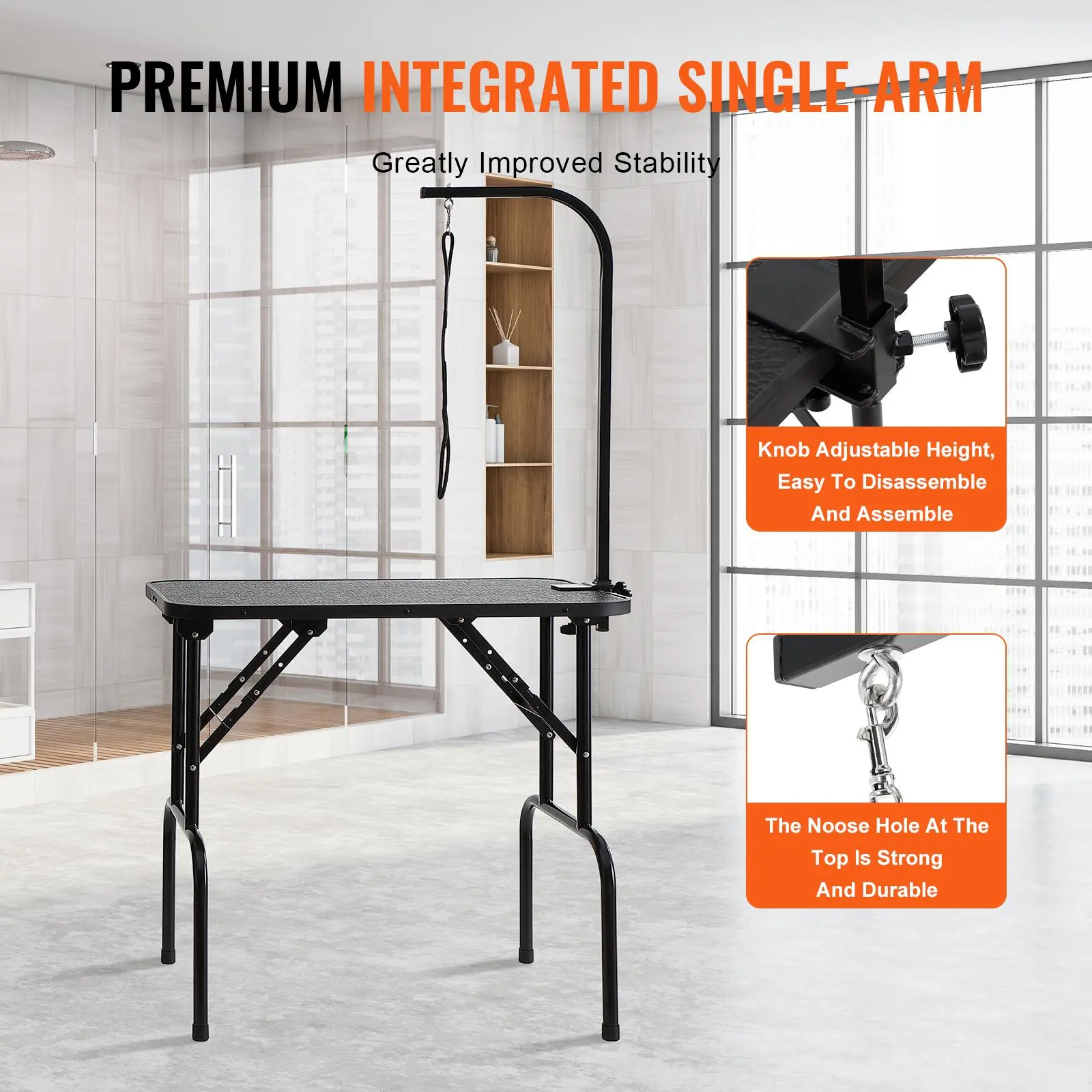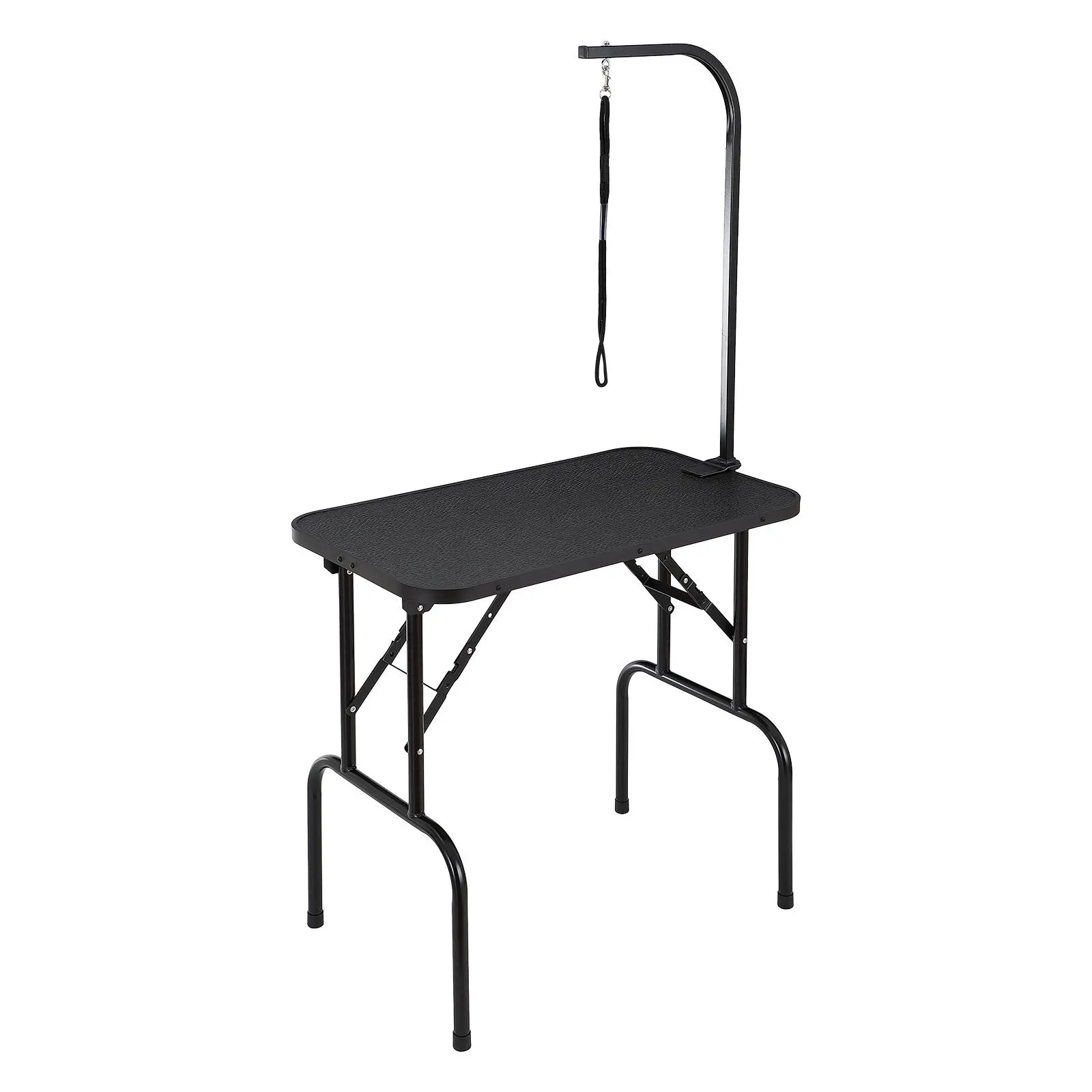 • Easy Installation: This pet grooming table is incredibly easy to install, with just four simple steps: Step 1 - unfold the grooming table and place it level; Step 2 - clamp the two iron fixtures securely onto the table; Step 3 - attach the H-shaped double arms; Step 4 - finally, install the storage shelf.