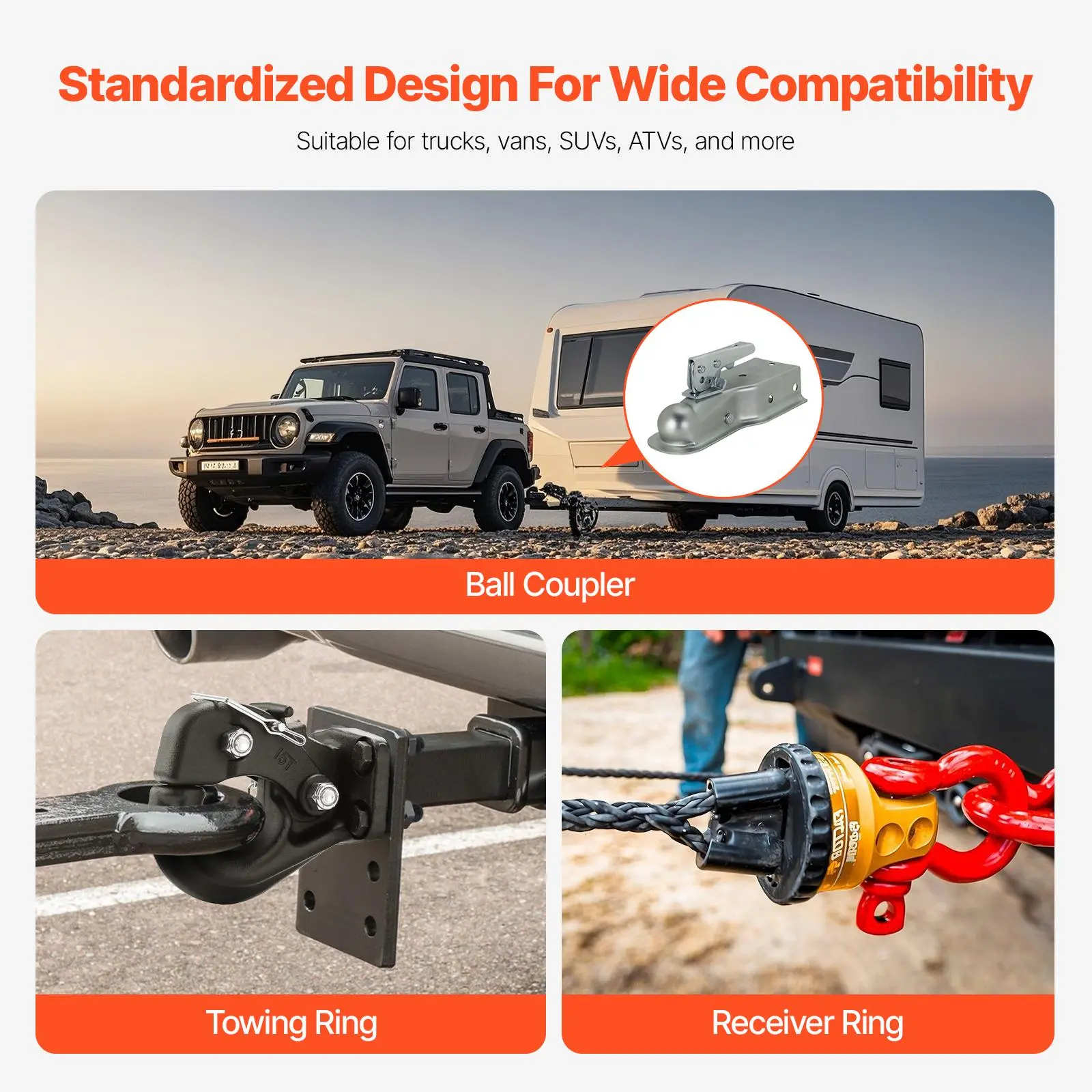 • Wide Compatibility: With a standardized size design, our pintle hook trailer hitches easily adapt when used with lunette rings, receiver rings, and ball couplers, making it compatible with various towing equipment, including trucks, tractors, SUVs, and ATVs.