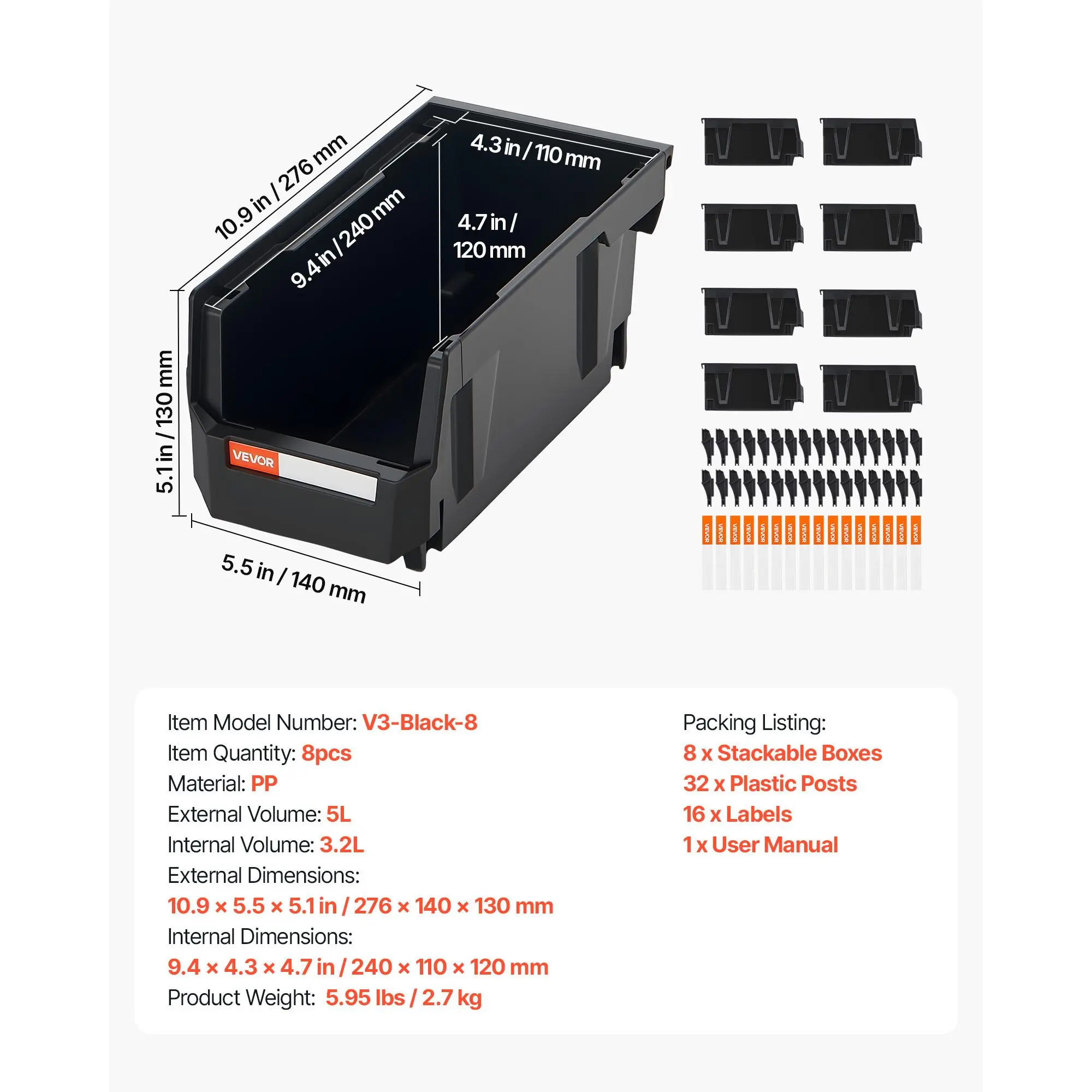 5. VEVOR Plastic Stackable Storage Bins, , 10.9 x 5.5 x 5.1 inch (8 Pack), Plastic Containers for Organizing and Storage Bins for Closet, Garage, Small Parts, Office Supplies and Other Accessories, Black