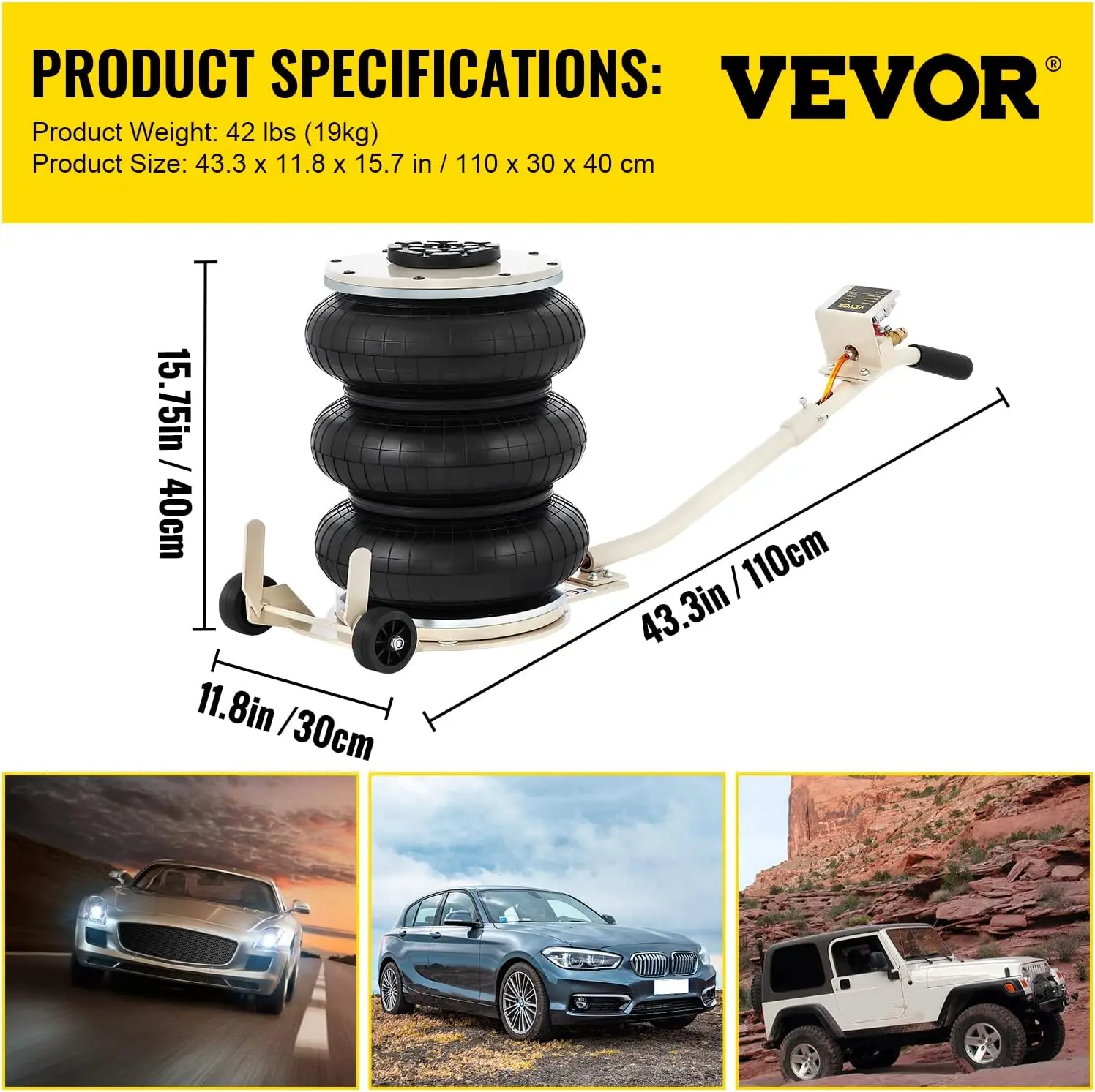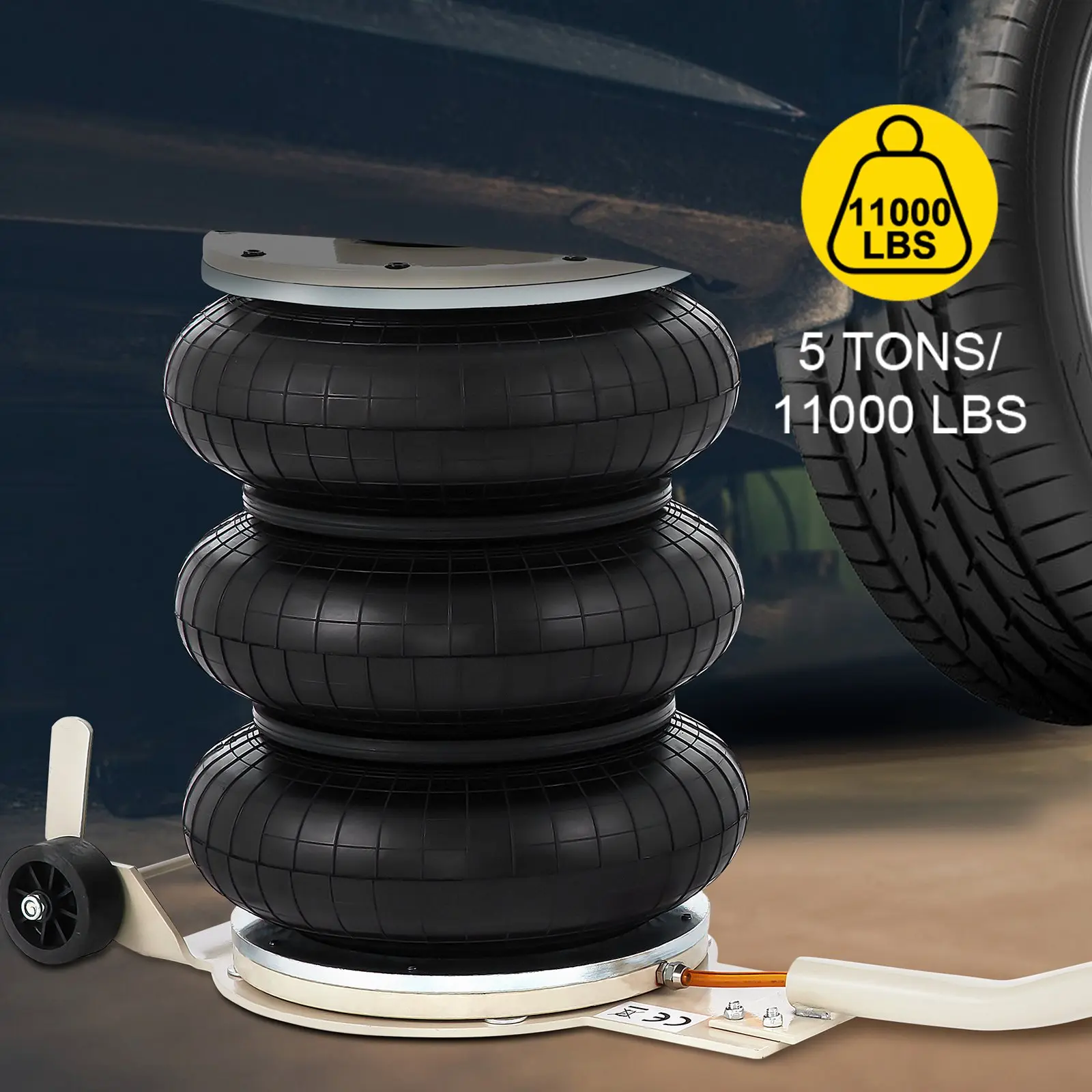 ·Labor-Saving Jack: The pneumatic jack capacity: 11000 lbs/5T. Minimum height: 6.3"/ 160 mm. Maximum height: 15.75"/400 mm. It only takes 5 seconds to lift. Working Temp: -60℃~ 50 ℃. Air inlet: G1/4. Our triple bag jack is the easiest and fastest way to make the car lifted.