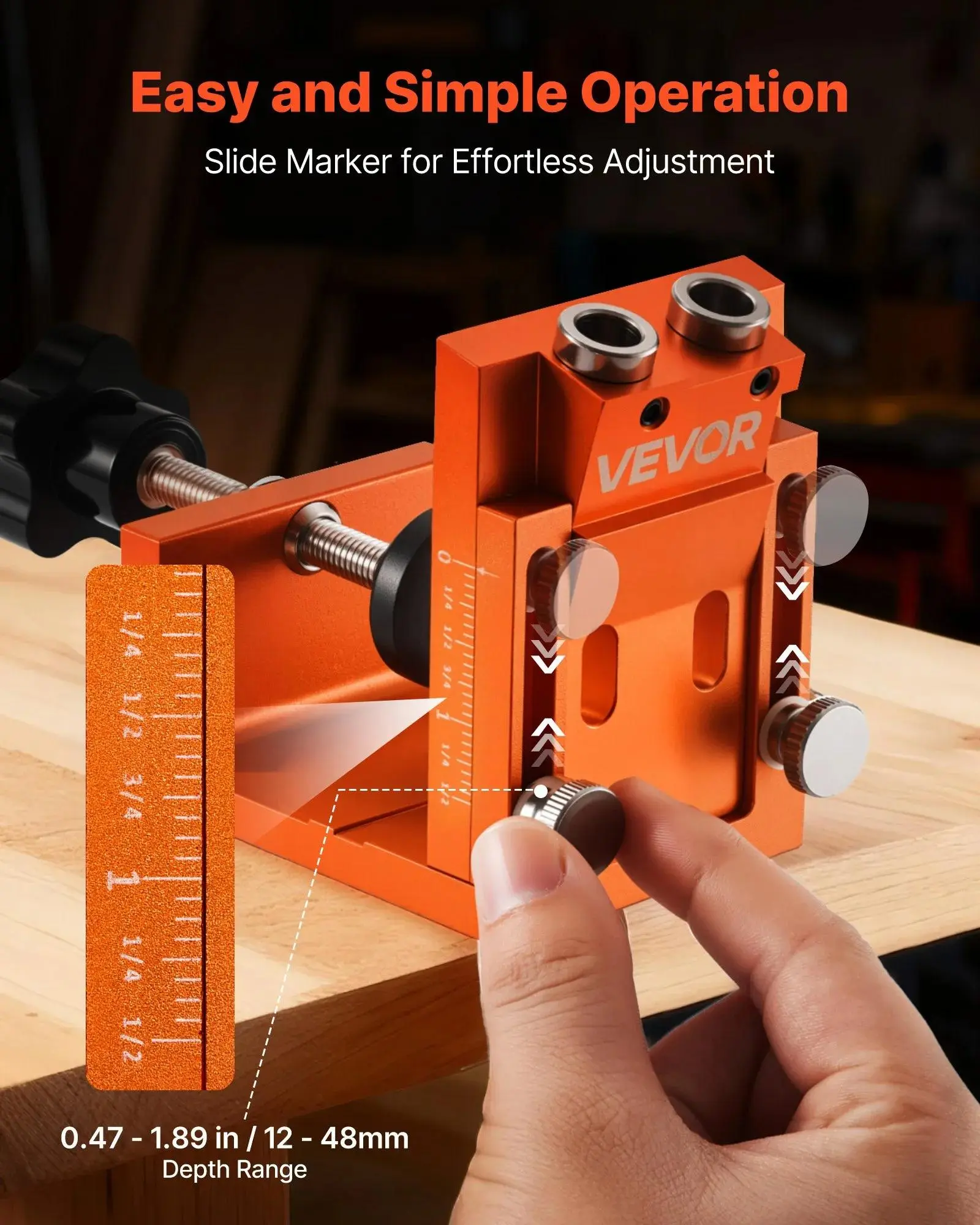 ·Depth Adjustment Made Effortless: With an adjustable range of 0.47 to 1.89 in (12 to 48 mm) and clear markings, our jig pocket hole system lets you tweak drilling depth in seconds—just slide the marked adjuster back and forth