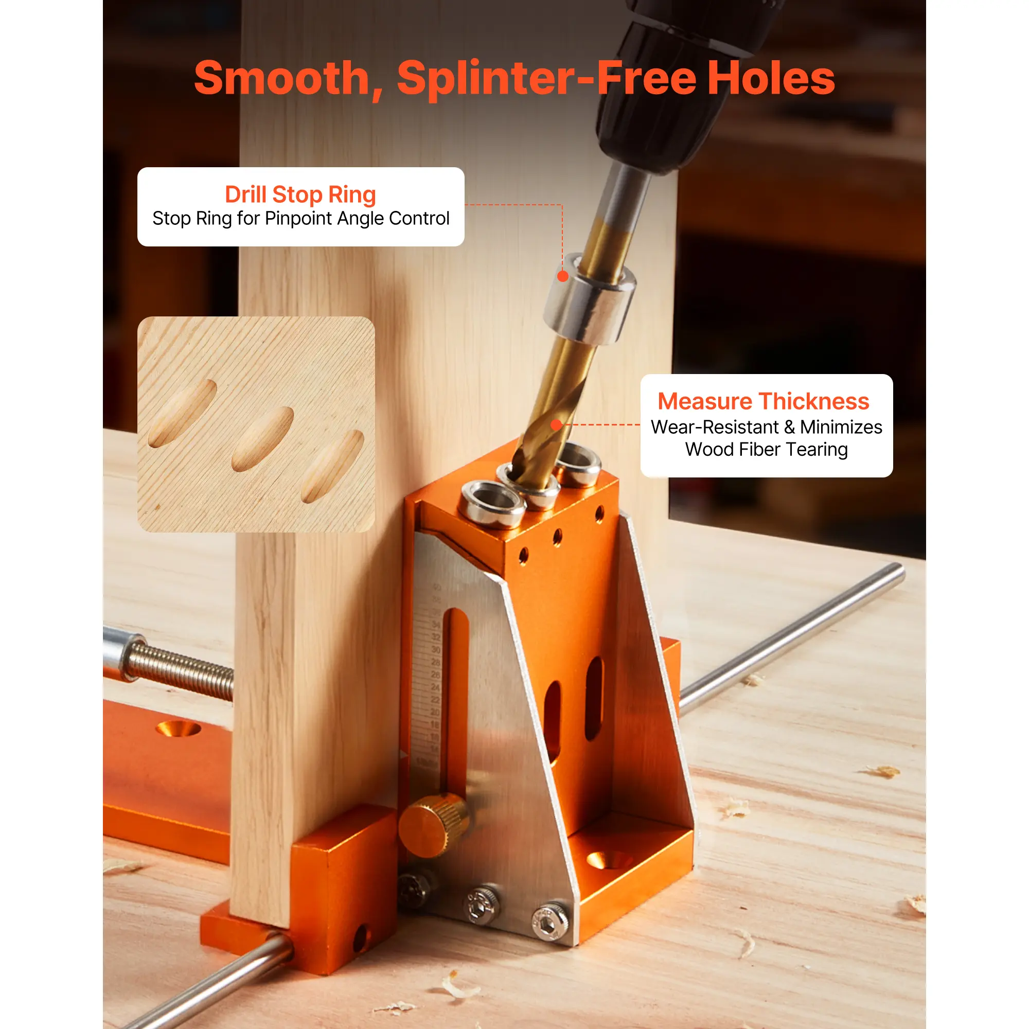 Three chip outlets avoid clogging, and the drill stop ring enables precise angle control. The adjustable depth from 1/2 to 1-1/2 in delivers smooth, accurate, splinter-free holes. This ensures efficient woodworking and high-quality results.