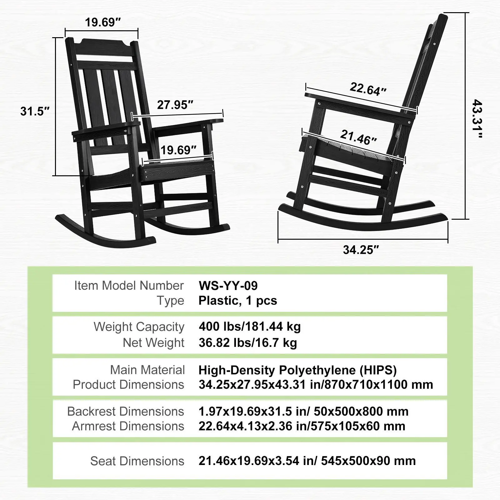 • Sturdy and Durable Material: This porch rocker is made from high-density polystyrene (HIPS) material, providing solid construction with enhanced impact resistance and stability. It supports up to 400 lbs, suitable for various body types. The material resists deformation, fading, and weather conditions, ensuring long-lasting use.
