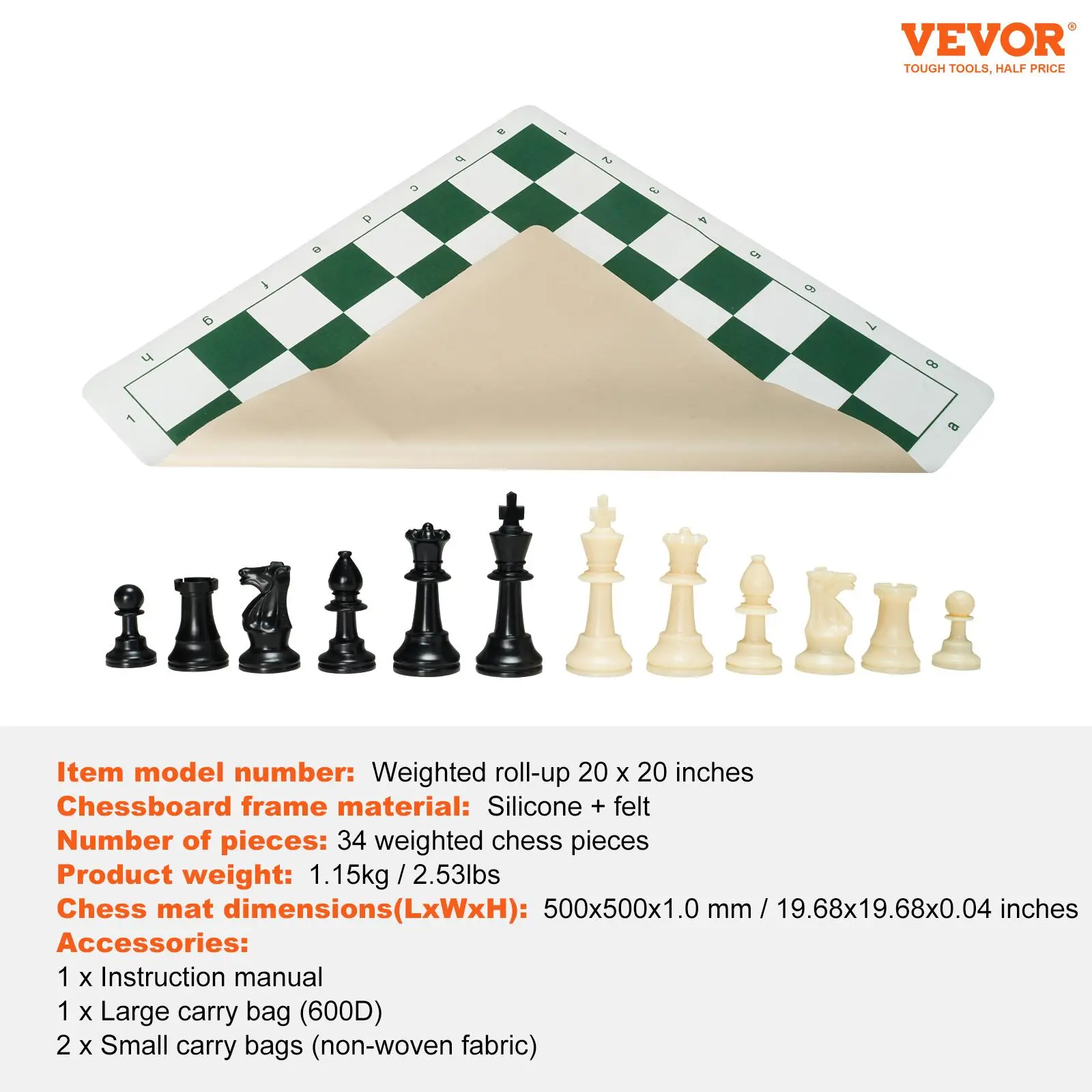 5. VEVOR Tournament Chess Set, TikTokShopBlackFriday, 20 Inch Roll-Up Beginner Chess Board, Foldable Silicone Chess Game with Plastic Weighted Chess Pieces & Storage Bag, Portable Travel Chess Board Gift for Family