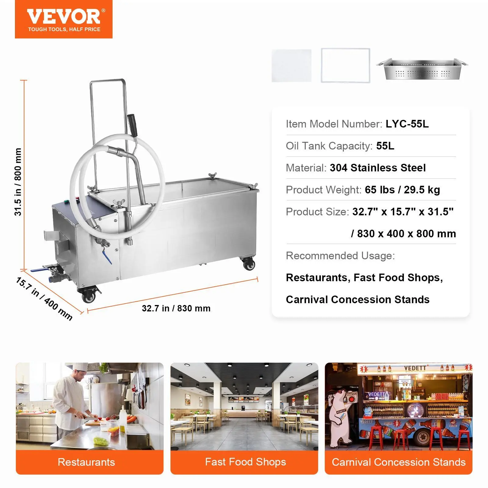 • 55L Large Capacity: The oil tank can hold 55L/14.5 gal of oil with a filtering speed ≥10 L/min, meeting your commercial needs for quickly filtering large amounts of oil. With a compact design of 32.7" x 15.7" x 31.5"/830 x 400 x 800 mm (including the faucet & pole), our fryer filter fits snugly into any kitchen, leaving you with plenty of room to maneuver.
