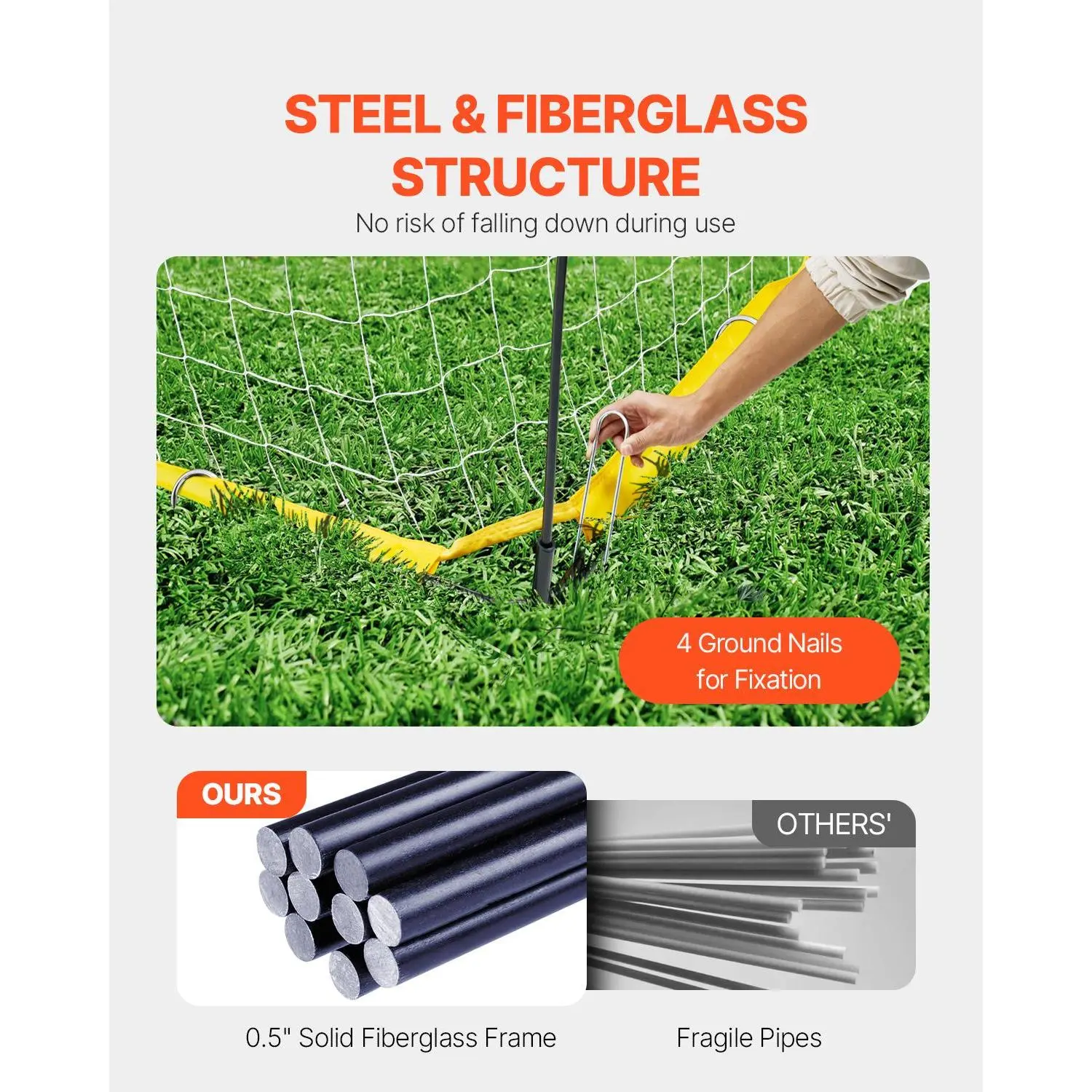 • Steel & Fiberglass Structure: The soccer net features a solid 0.5-inch fiberglass frame combined with steel components for superior strength and stability. With the inclusion of six ground nails for secure fixation, there's no risk of the goal falling down during intense use.
