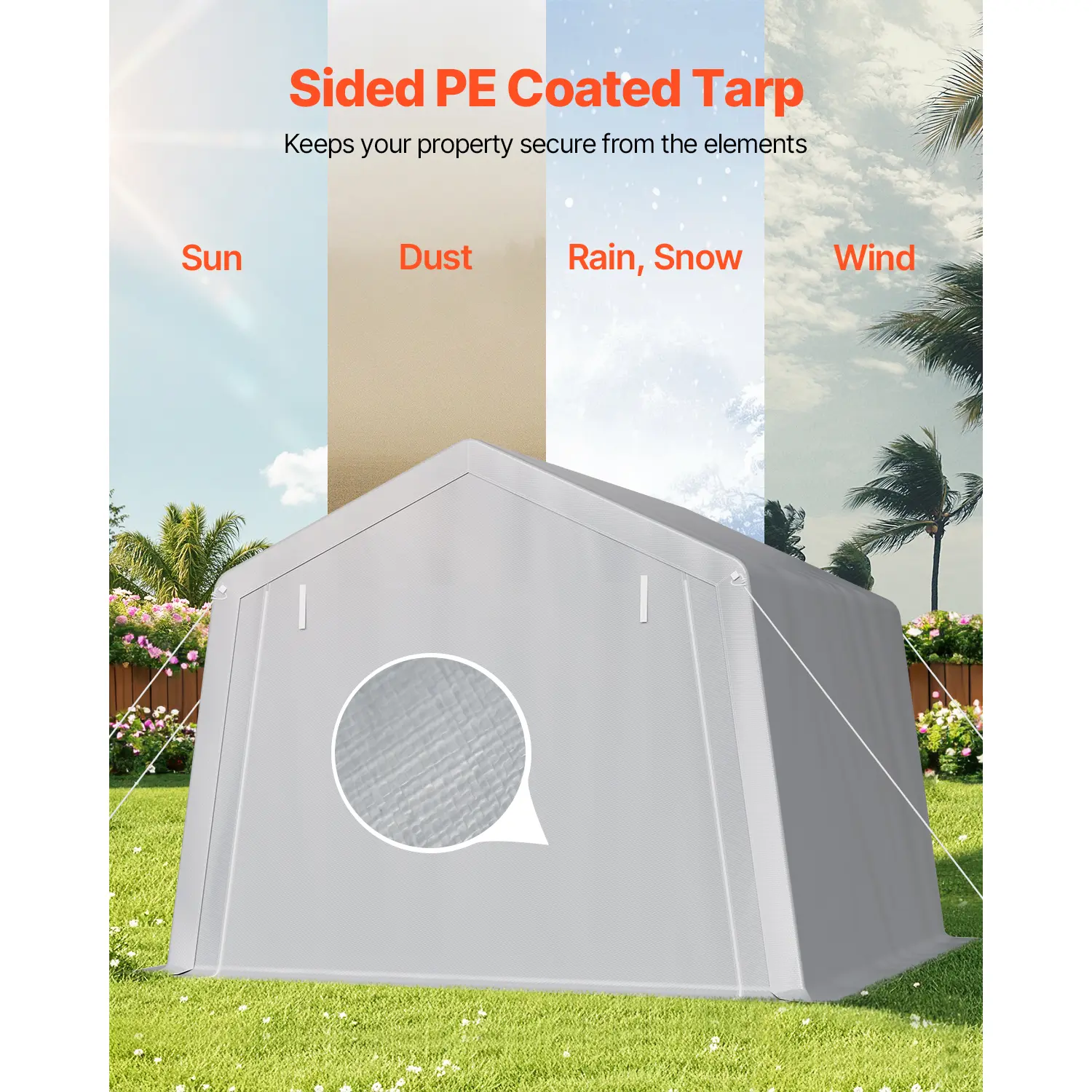 • Zipper Door Design: Flexible to seal or roll up. When sealed, the zipper fits snugly, fully protecting your items from dust, moisture, and other external factors. To access your items, simply roll up the zipper door for easy and quick access to your canvas storage sheds.