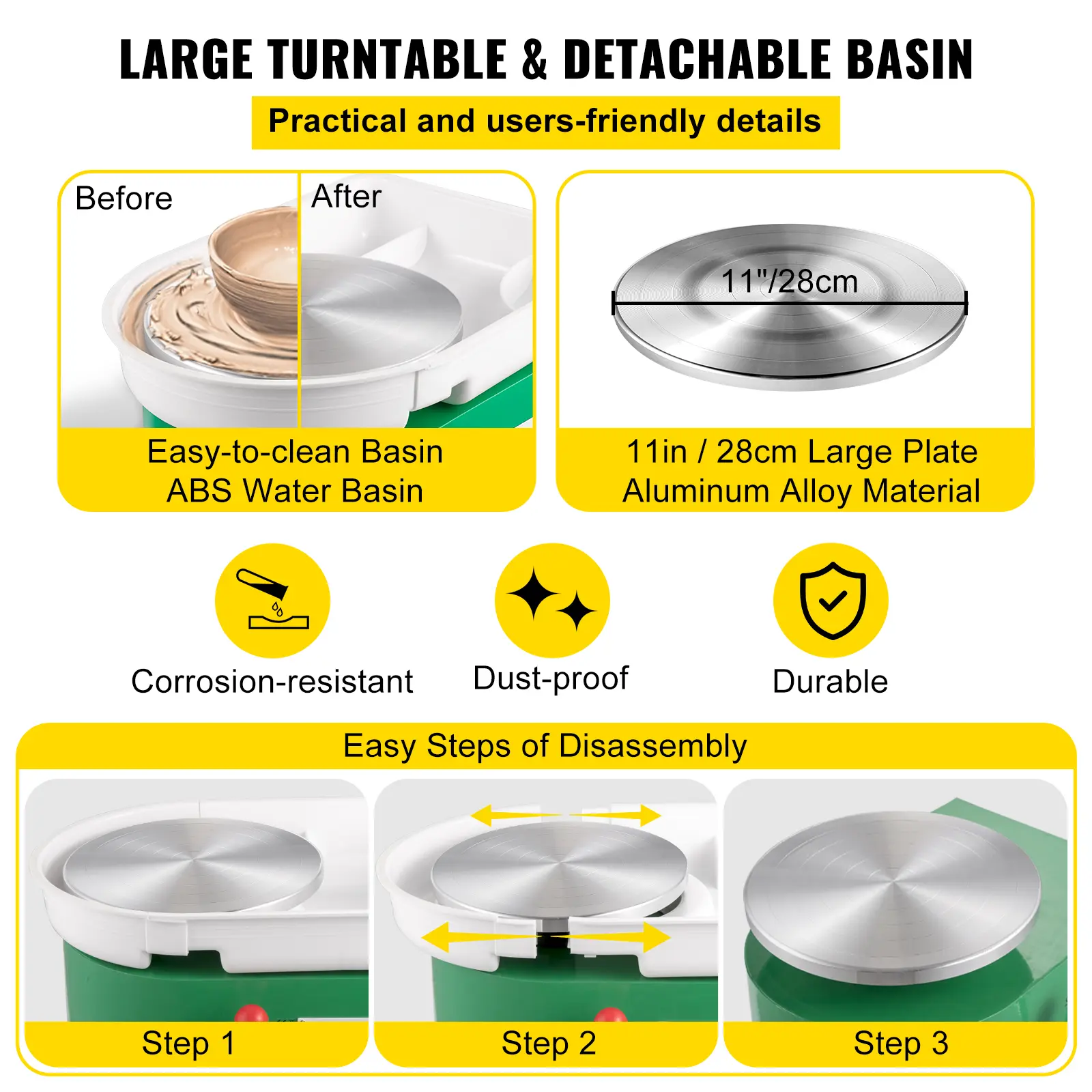 • 11" Aluminum Alloy Wheel: 11" / 28 cm large aluminum alloy turntable allows users to draw large pieces quickly. Besides, an enclosed water basin prevents mud from eroding and penetrating the fuselage. Moreover, it is detachable for easy cleaning.