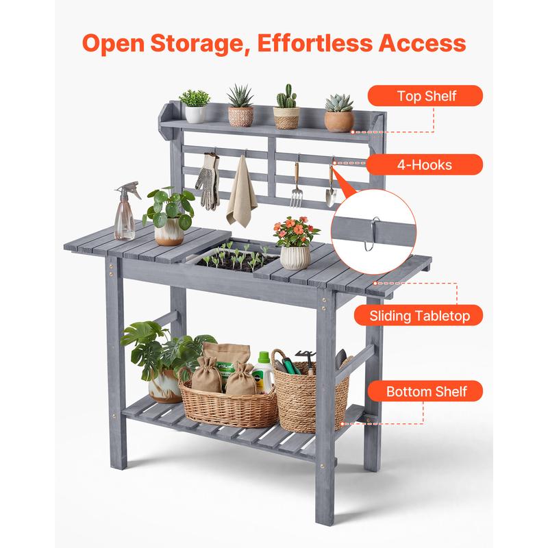 • Sliding Tabletop: Opening the outdoor potting bench, the plastic sink beneath facilitates planting, watering, and mixing soil. When closed, the neat and spacious surface is ideal for gardening tasks and storing items