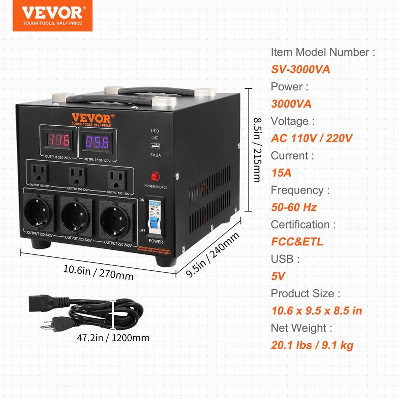 • Portable & Compact Design: The step up step down transformer size is 10.6 x 9.5 x 8.5 in/270 x 240 x 215 mm, not taking up too much space. With an 20.1 lbs/9.1 kg net weight and convenient handle design, it is easy to carry and transport without effort.