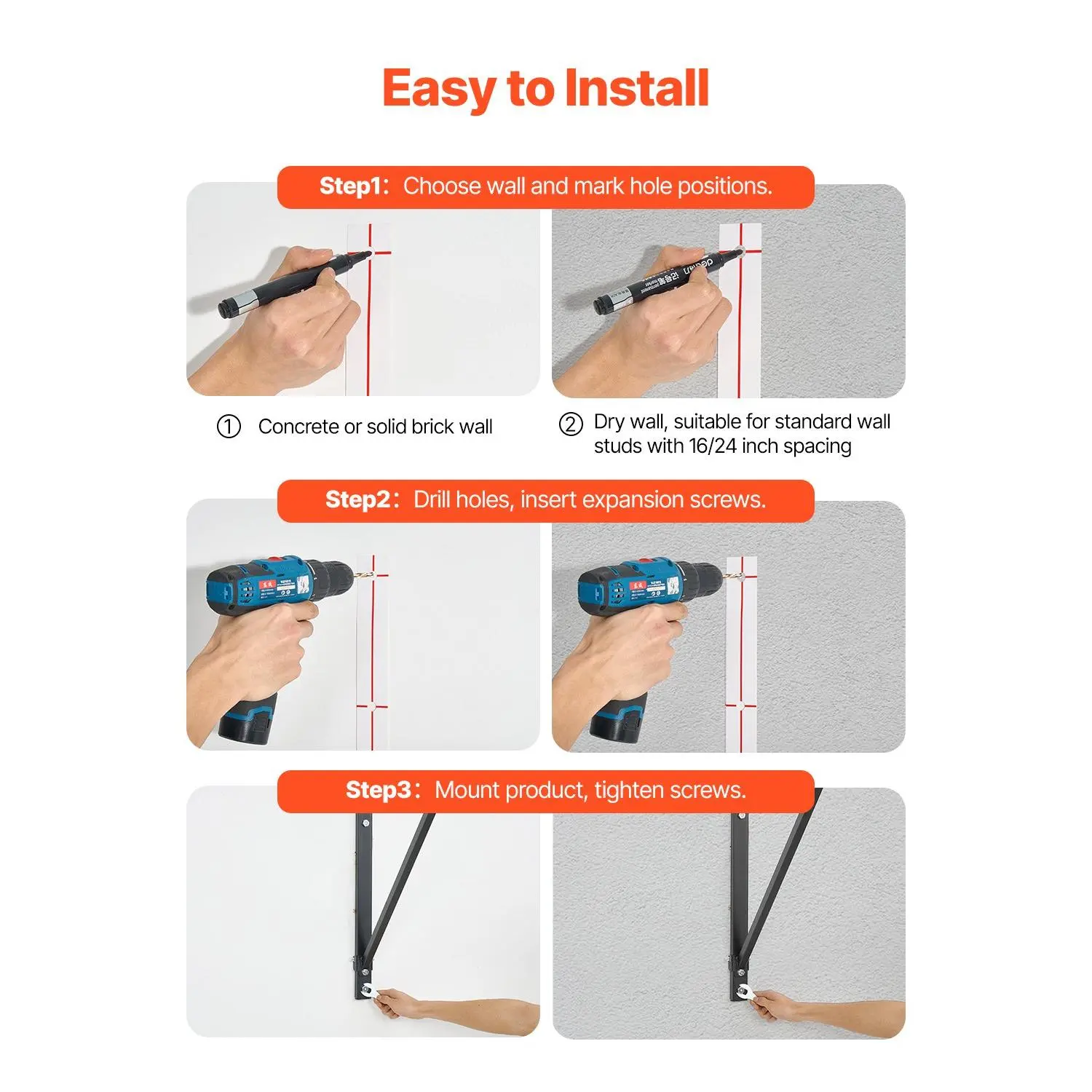 440LBS Carbon Steel Frame: This wall mounted pull up bar is made of heavy-duty carbon steel, 1.4mm thick powder coating for rust and corrosion resistance.Max weight capacity is 440lbs, providing stability and security.Suitable for both home and gym environments, meeting all your fitness needsSmart Space Design: With a 30-inch distance from the wall, this chin up workout training station ensures you won't hit the wall during full-range movements, making it perfect for smaller spaces.Compatible with accessories like ab straps and gym rings, allowing for pull-ups, resistance bands, ring exercises, and more (NOTE: Need to purchase separately)Dual Adjustment Options: Two depth settings (22 in/30in) allow you to switch between compact storage and professional training modes.Use this heavy duty wall mounted pull up bar to easily shape your perfect bodyEasy Installation: Designed with a 48-inch hole spacing, this upper body workout pull up bar comes with positioning hole paper and expansion screws for quick installation.Supports wood/concrete walls1.25IN Anti-Slip Handles: The total width is 50 inches, with 1.25-inch knurled grips.The anti-sweat texture reduces slippage during intense workouts.An ideal workout pull up bar bar for home useVEVOR Pull Up Bar, 50 in Width Wall Mounted Pull Ups, Adjustable Depth 22" or 30" from Wall, Heavy Duty Steel Upper Body Workout Bars, 440 lbs Weight Capacity Chin Up Training Station, for Home Gym