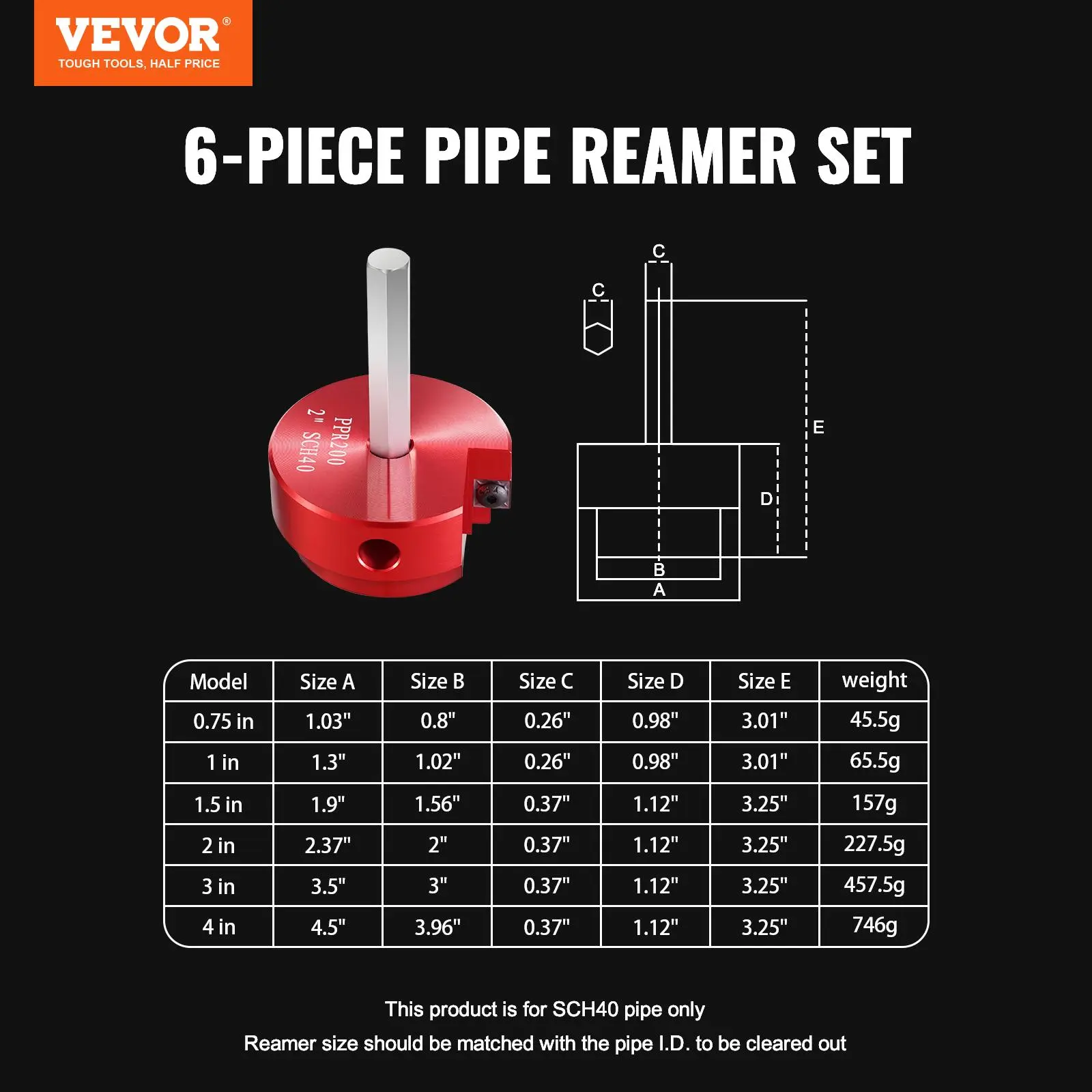 VEVOR PVC Pipe Reamer Kit, Aluminum Alloy, PVC Pipe Fitting Reamer Plumbing Tools Kit, PVC Socket Saver for SCH 40, Contains 3/4", 1", 3/2", 2", 3", 4'', for Water Lines, Drain Lines, Vent Lines