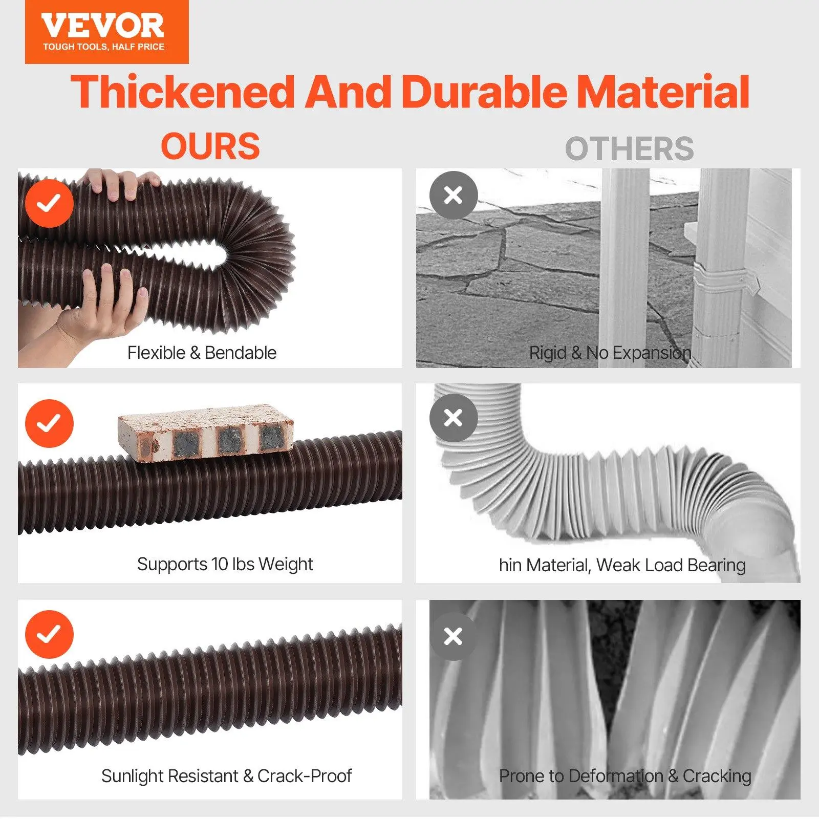 Durable PE Material: Crafted from thickened PE material, our rain gutter downspout extension provides outstanding flexibility, allowing it to bend and stretch with ease while resisting aging.It supports up to 10 lbs of weight without cracking, ensuring a freeze-proof and burst-resistant performance for long-term durability.Extends Up to 63 Inches: This down spout drain extension stretches from 22 inches to a maximum length of 63 inches.It comes with two adapters compatible with 2x3-inch, 3x3-inch, and 3x4-inch downspout sizes, and its flexible design can be bent into various shapes for efficient drainage.Upgraded Visual Filter: The gutter downspout's adapter features a transparent filter screen to effectively block leaves and debris, preventing clogs in the pipe.The see-through panel allows easy inspection and can be conveniently removed for quick cleaning.Wide Application: This gutter extension for downspout effectively channels rainwater away from your home, preventing basement flooding and safeguarding your foundation from water damage.Easy Installation: Simply stretch the downspout extender to the desired length, connect it by twisting, and secure it with screws for a leak-resistant, sturdy connection.VEVOR Rain Gutter Downspout Extensions, 2-Pack Flexible Downspout Extender, Down Spout Drain Extension Extendable from 22" to 63", Gutter Extensions with Adapters, for Rainwater Drainage, Brown