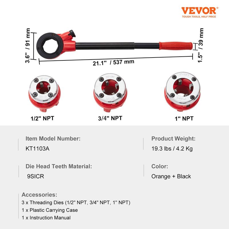 ·All-in-One Versatile Kit: VEVOR ratcheting pipe threader kit comes with 3PCS NPT threading dies: 1/2" NPT, 3/4" NPT, 1" NPT , a handle and extension bar, a wrench bracket and carrying case. Versatile threading tool can accommodate a variety of different sized pipes, easy to thread aluminum, iron, galvanized, copper, and other types of pipes.