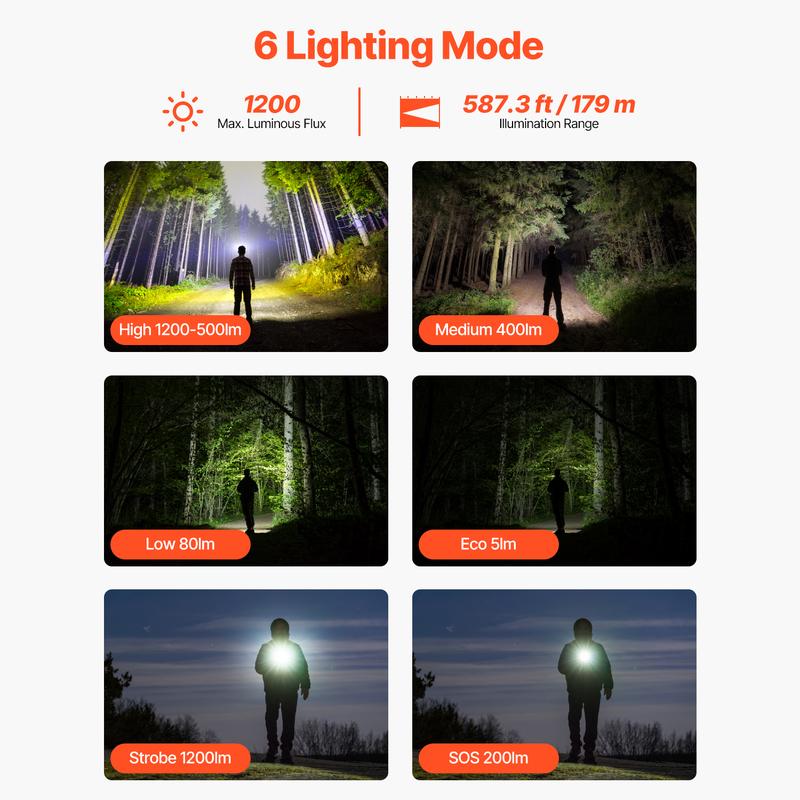 • Super Bright with 6 Modes : With 6 lighting modes (High/Medium/Low/Eco/Strobe/ SOS), 1200 lm maximum luminous flux and 587.3 ft (179 m) illumination range, this high lumens flashlight ensures powerful, reliable lighting, perfect for hiking, camping, and emergency situations.