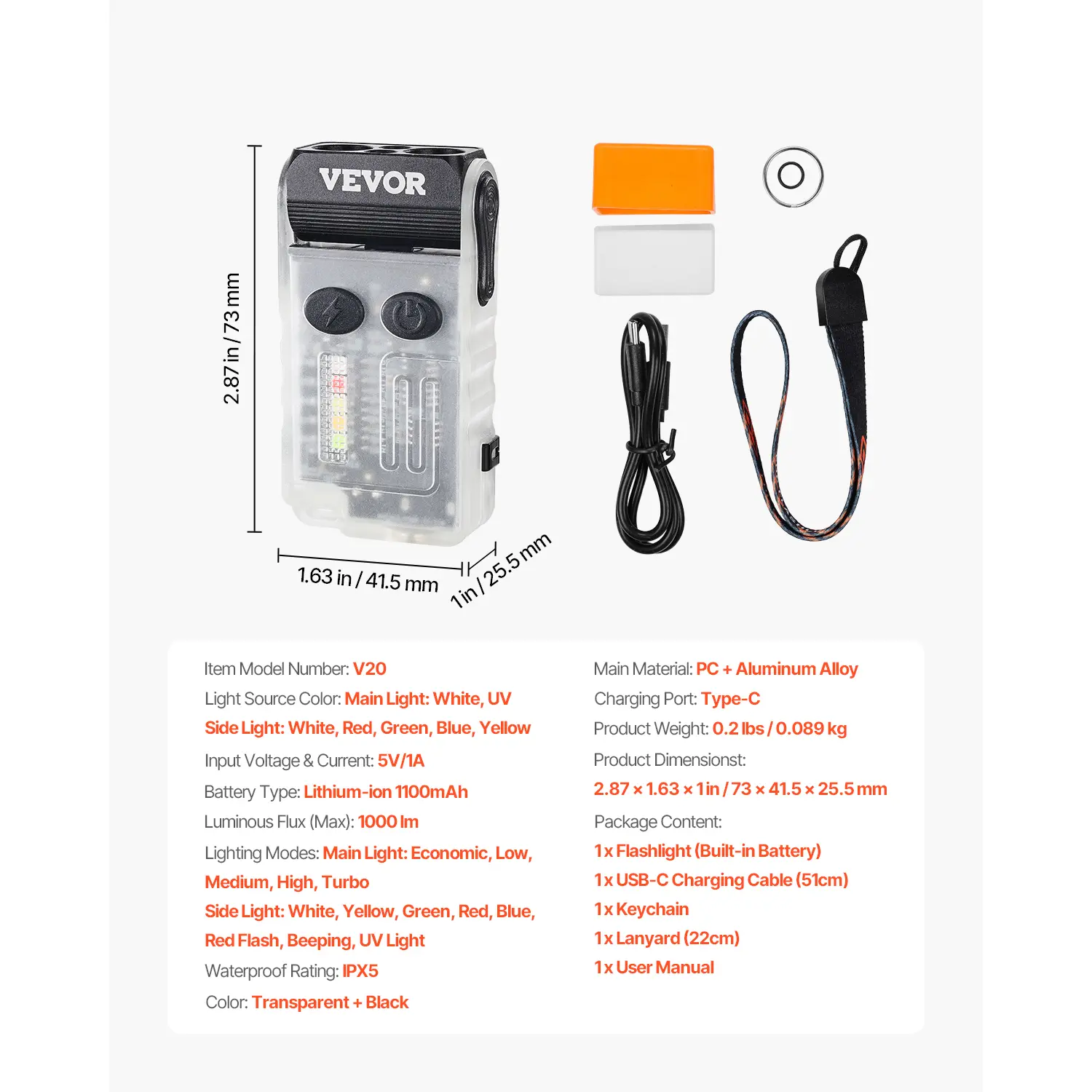 • 13 Lighting Modes: This keychain flashlight offers 13 lighting modes, including 5 main light modes (Turbo, High, Medium, Low, Economic) and 8 side light modes (White, Warm, Green, Red, Blue, Red Flash, UV, Beeping). Ideal for camping, car repairs, night walks, emergencies, fluorescent agent detection, banknote security checks, and more.