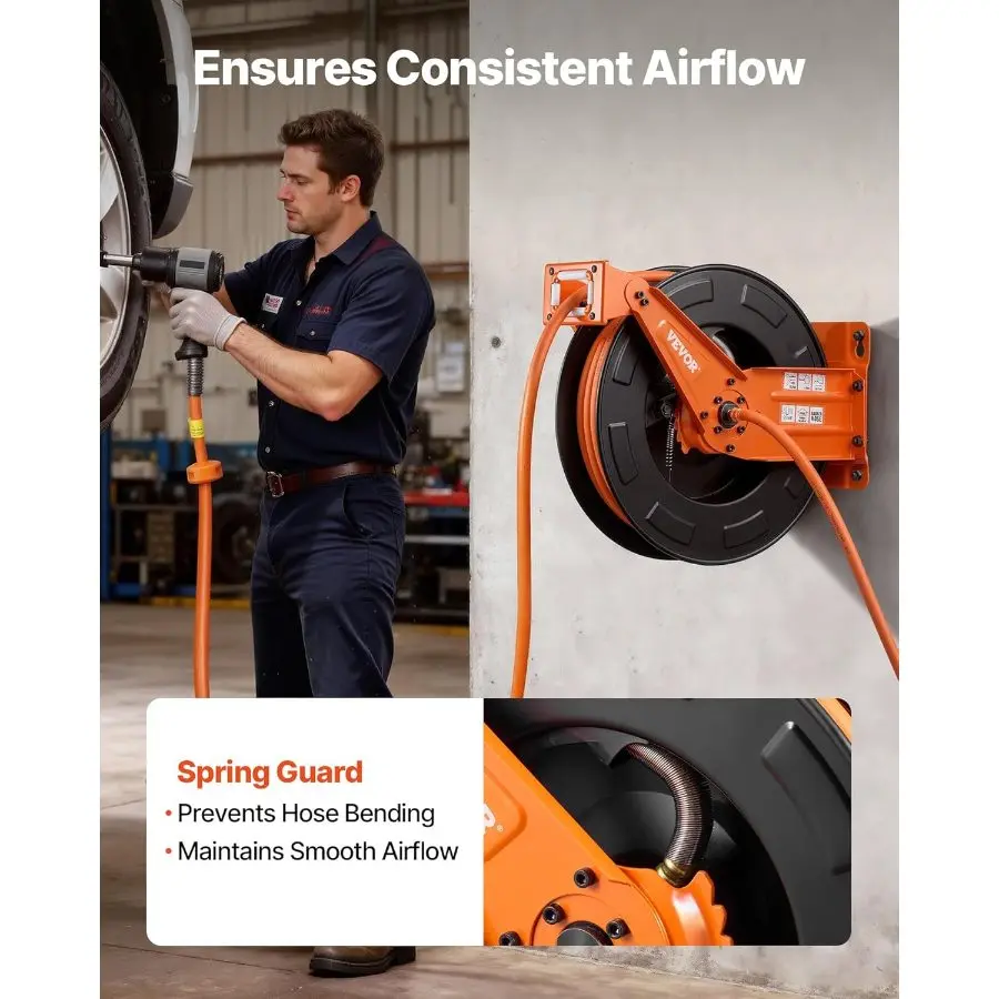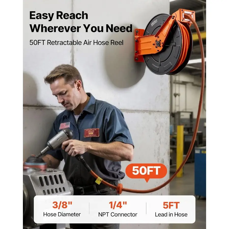 5. VEVOR Retractable Air Hose Reel, 3/4 Inchx 50 FT PVC Air Hose Max 300PSI, Auto Rewind Air - Compressor Hoses Reel with 5 ft Lead in, Ceiling/Wall Mount Heavy Duty Steel Double Arm