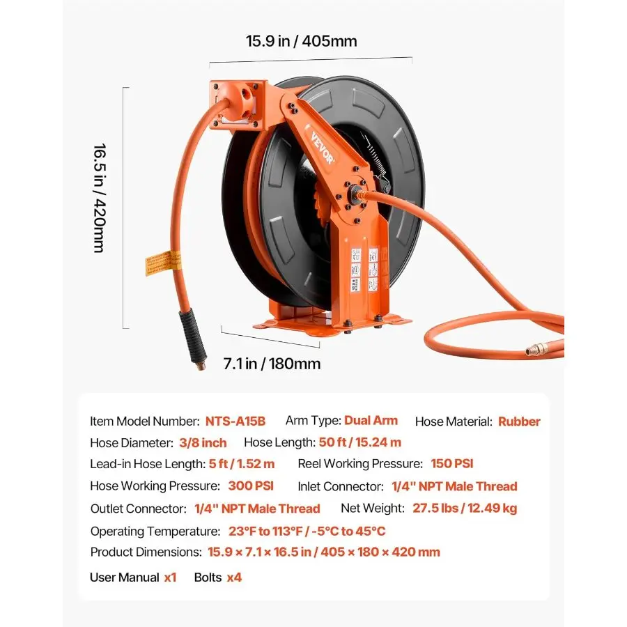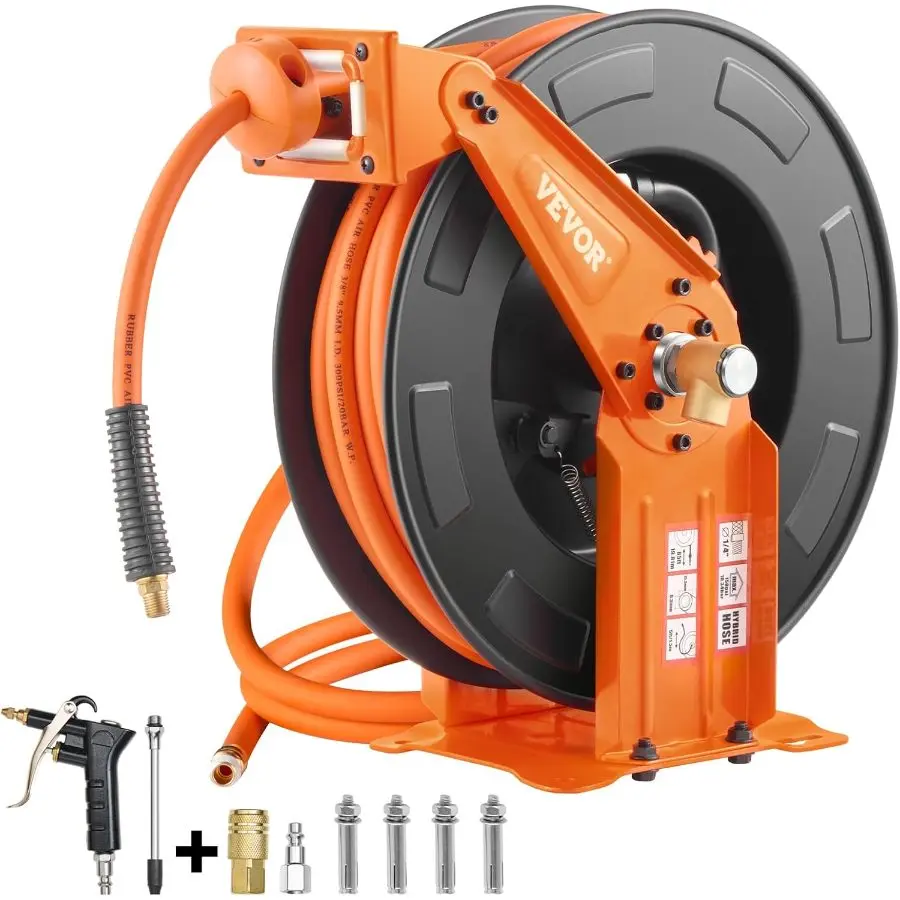 VEVOR Retractable Air Hose Reel, 3/4 Inchx 50 FT PVC Air Hose Max 300PSI, Auto Rewind Air - Compressor Hoses Reel with 5 ft Lead in, Ceiling/Wall Mount Heavy Duty Steel Double ArmVEVOR Retractable Air Hose Reel, 3/4 Inchx 50 FT PVC Air Hose Max 300PSI, Auto Rewind Air - Compressor Hoses Reel with 5 ft Lead in, Ceiling/Wall Mount Heavy Duty Steel Double Arm