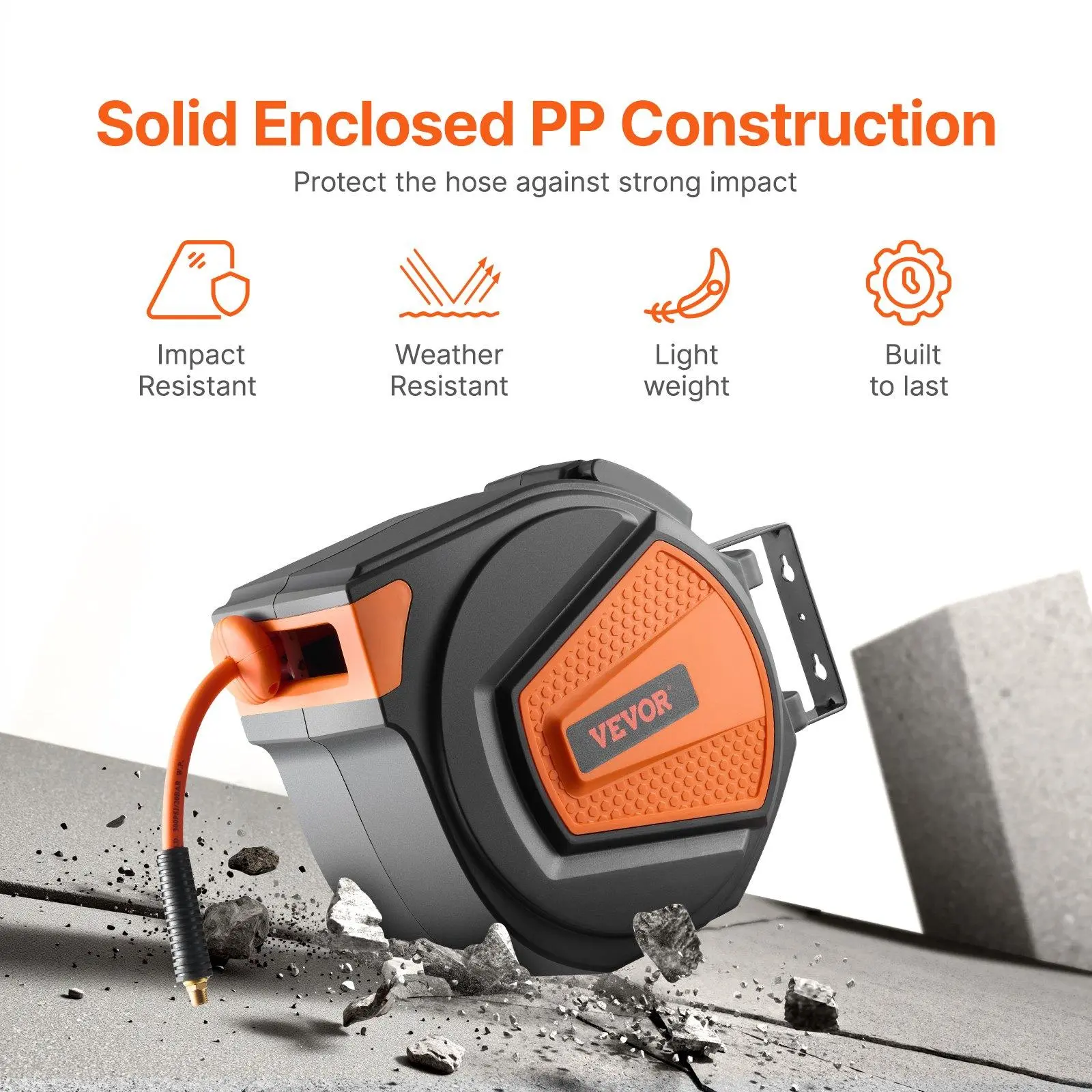 ·Durable Hybrid Polymer: VEVOR retractable air hose reel features a high-quality 3/8 inch x 65ft hybrid polymer hose that can withstand pressures of up to 300PSI. Designed to resist twisting, crushing, expanding, and bursting under pressure, it maintains its flexibility in all weather conditions with a temperature range of -4°F to 113°F. Say goodbye to interruptions in water flow and tangled hoses.