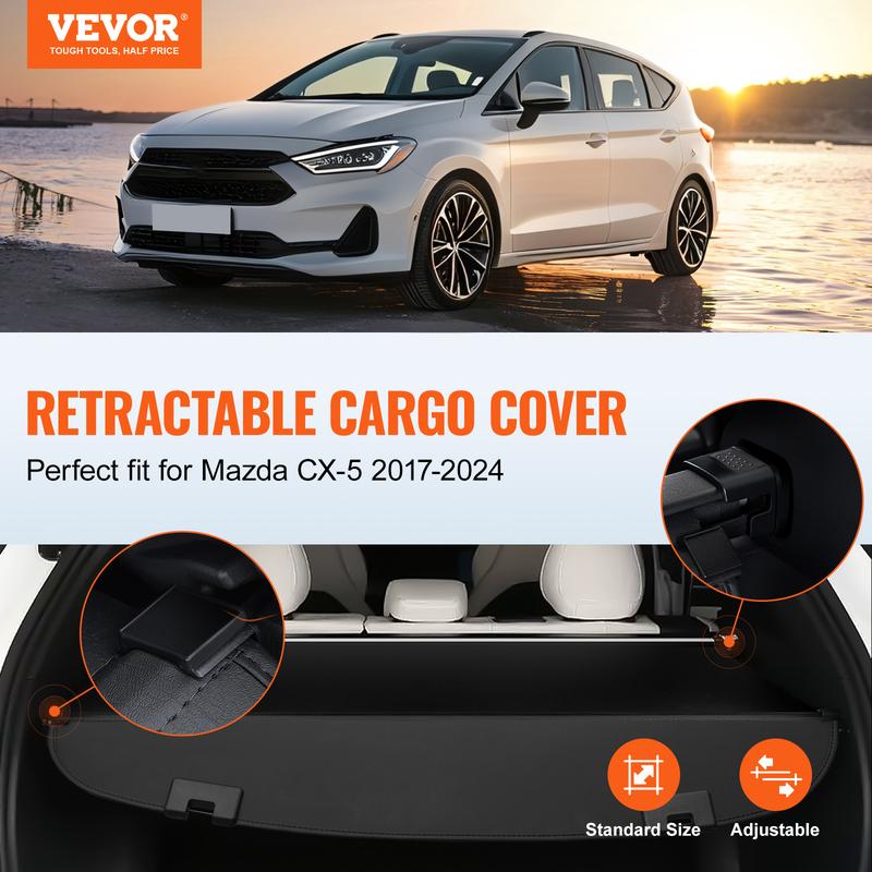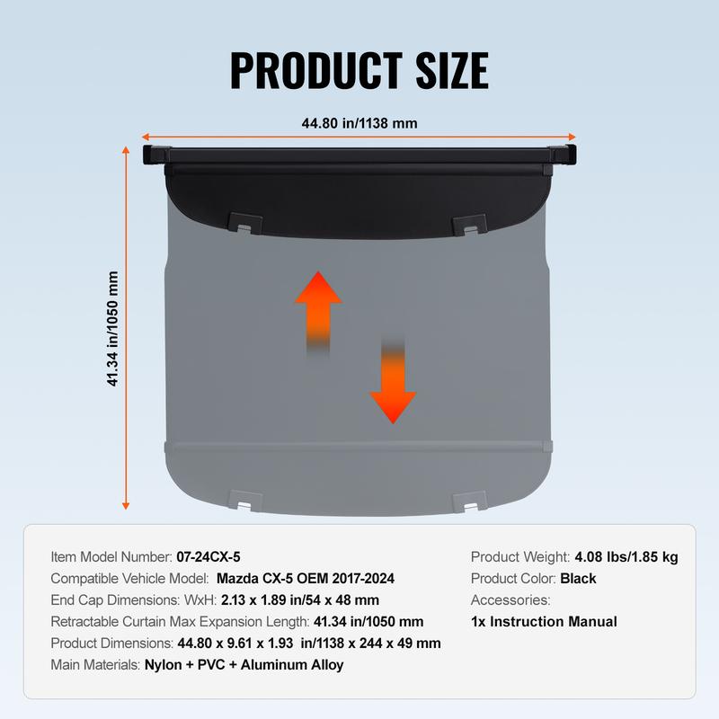 • Vehicle Compatibility: This retractable cargo cover is suitable for the original Mazda CX-5 2017-2024. Please verify your vehicle's model year before purchasing. This cover is crafted to seamlessly fit the curvature of your vehicle's luggage compartment, ensuring a tidy and organized space.