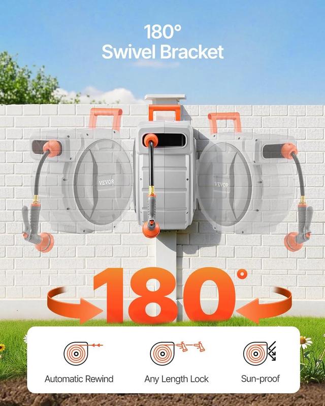 ·180° Flexible Rotation: The adjustable 180° swivel bracket allows the garden hose reel to move in any direction, while the compact design saves space in your garage or garden, keeping your outdoor area neat and organized.