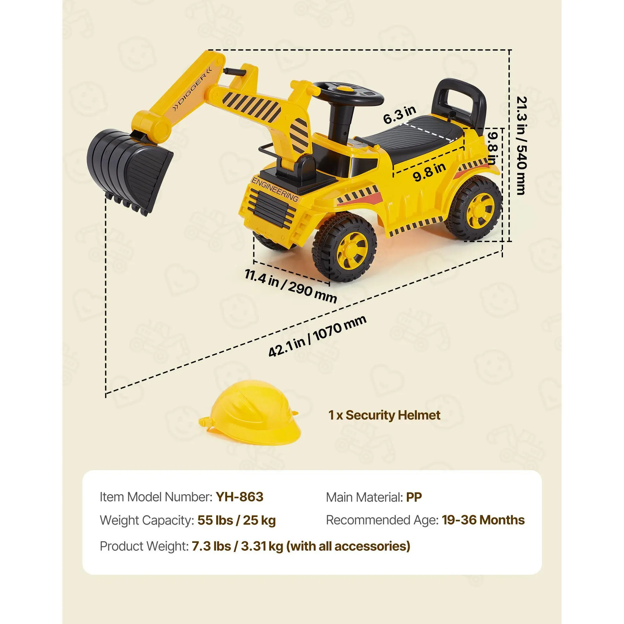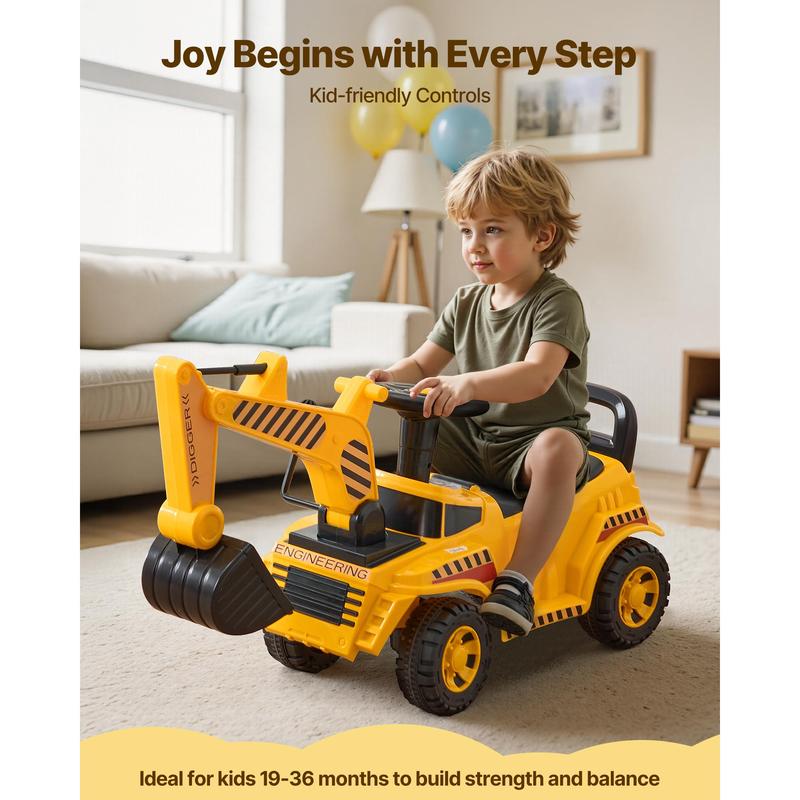 • Mini Crane Operator: With the control lever, kids can raise and lower the digger arm, steer with the wheel, and enjoy realistic "Chug-chug" sounds. Complete with a security helmet, our ride on car is the ideal way to develop hand-eye coordination through play