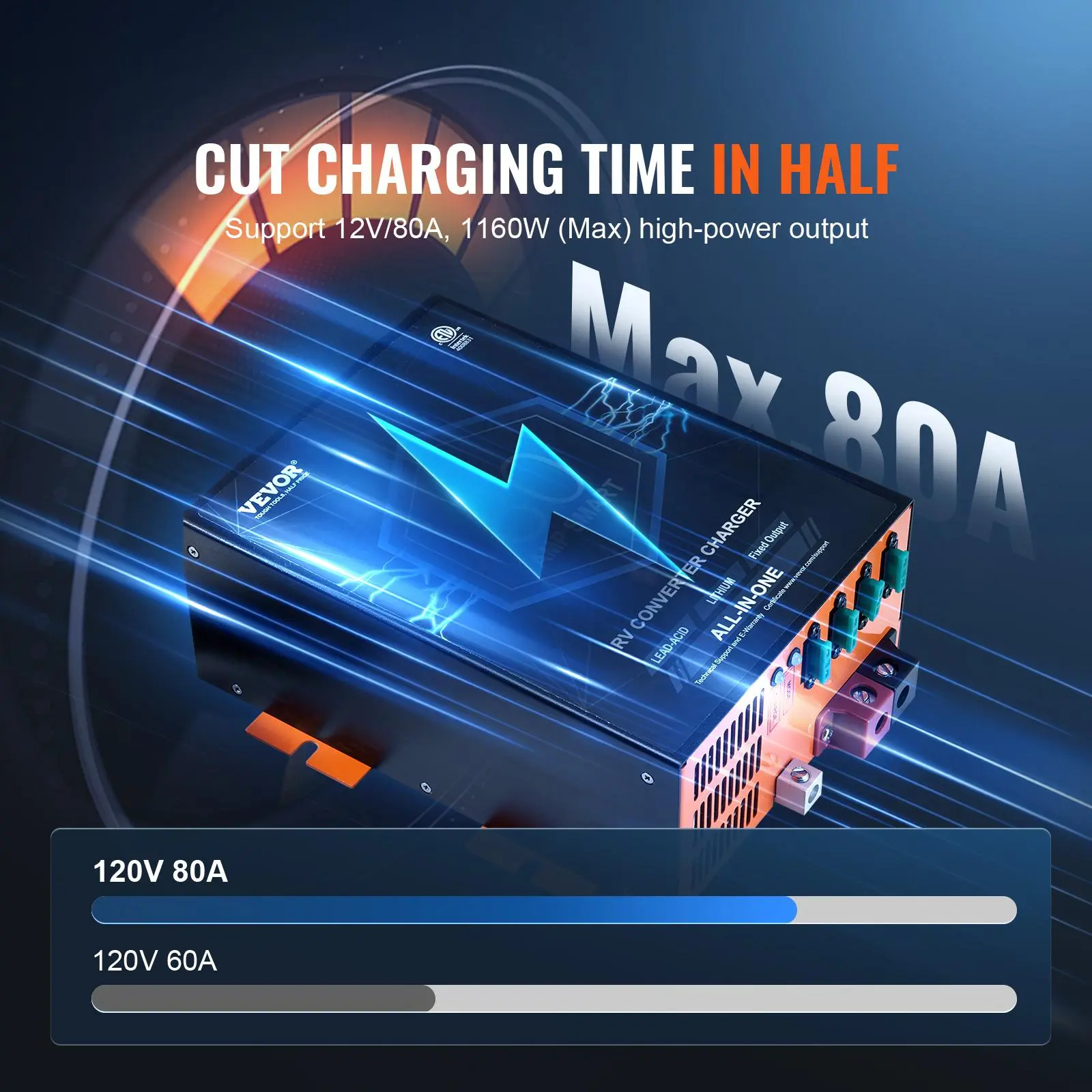 • High-Performance 80A Converter: Delivering up to 80A of clean current, our RV power converter charge effortlessly drives all your RV electronics and appliances, from sound systems to lighting, ensuring comfort on every journey. Ideal for large-capacity RV batteries ranging from 75Ah to 80Ah.