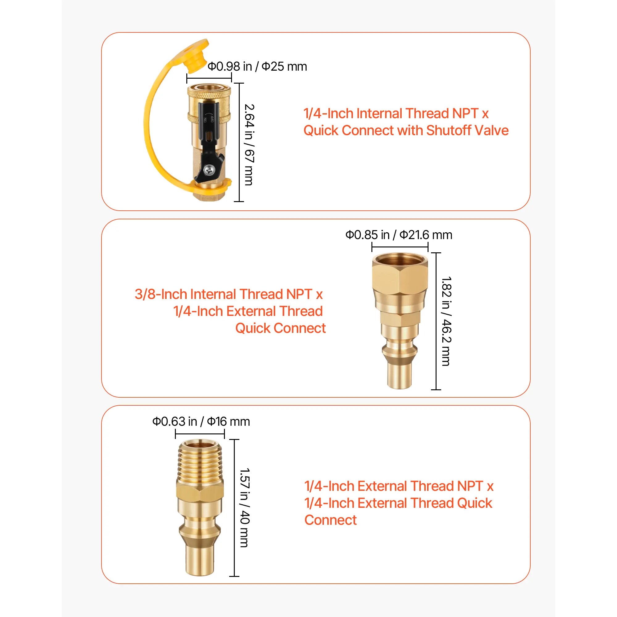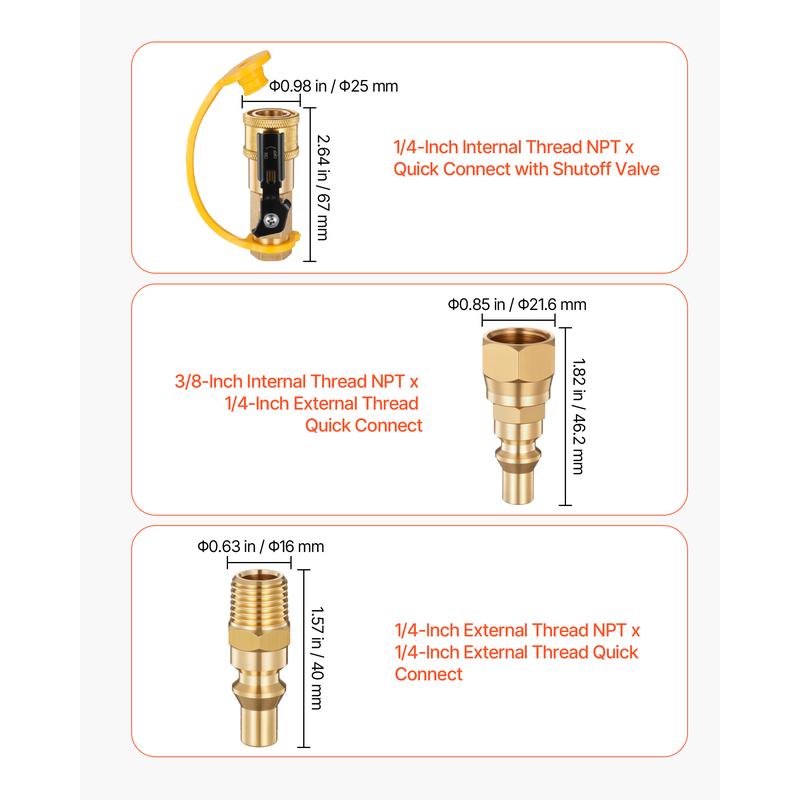 • 7-Piece Quick Connect Kit: This propane quick connect kit includes 7 brass fittings and PTFE tape—compatible with 1/4-inch and 3/8-inch female QC fittings. It’s the all-in-one setup your RV and propane gear have been waiting for