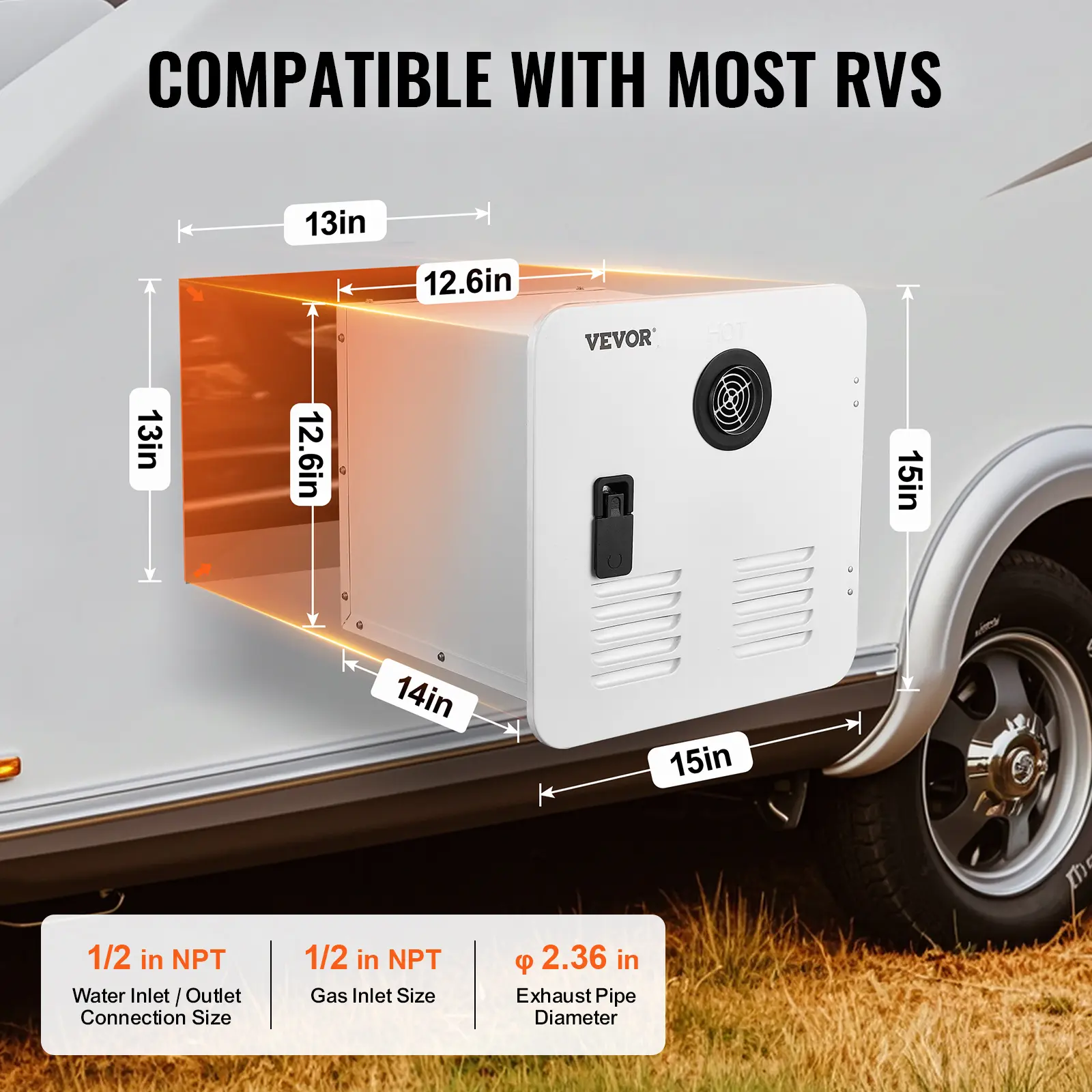 • Compatible with Most RVs: With a door size of 15x15 inches, a rear chamber size of 12.6x12.6x14 inches, and 1/2" NPT water and gas connectors, plus a φ2.36" exhaust pipe, this camper water heater is designed to suit various RVs. Quick connections make setup a breeze!