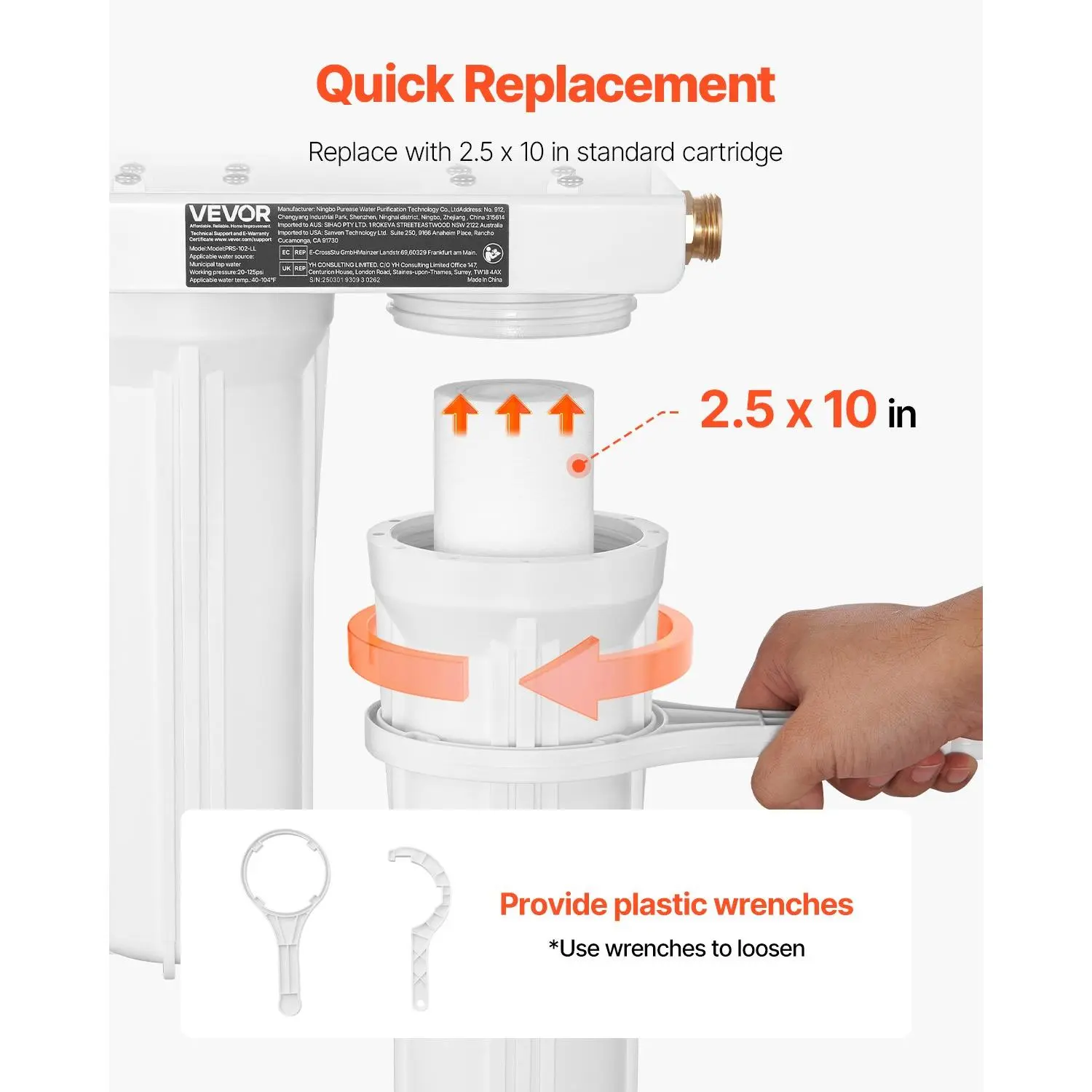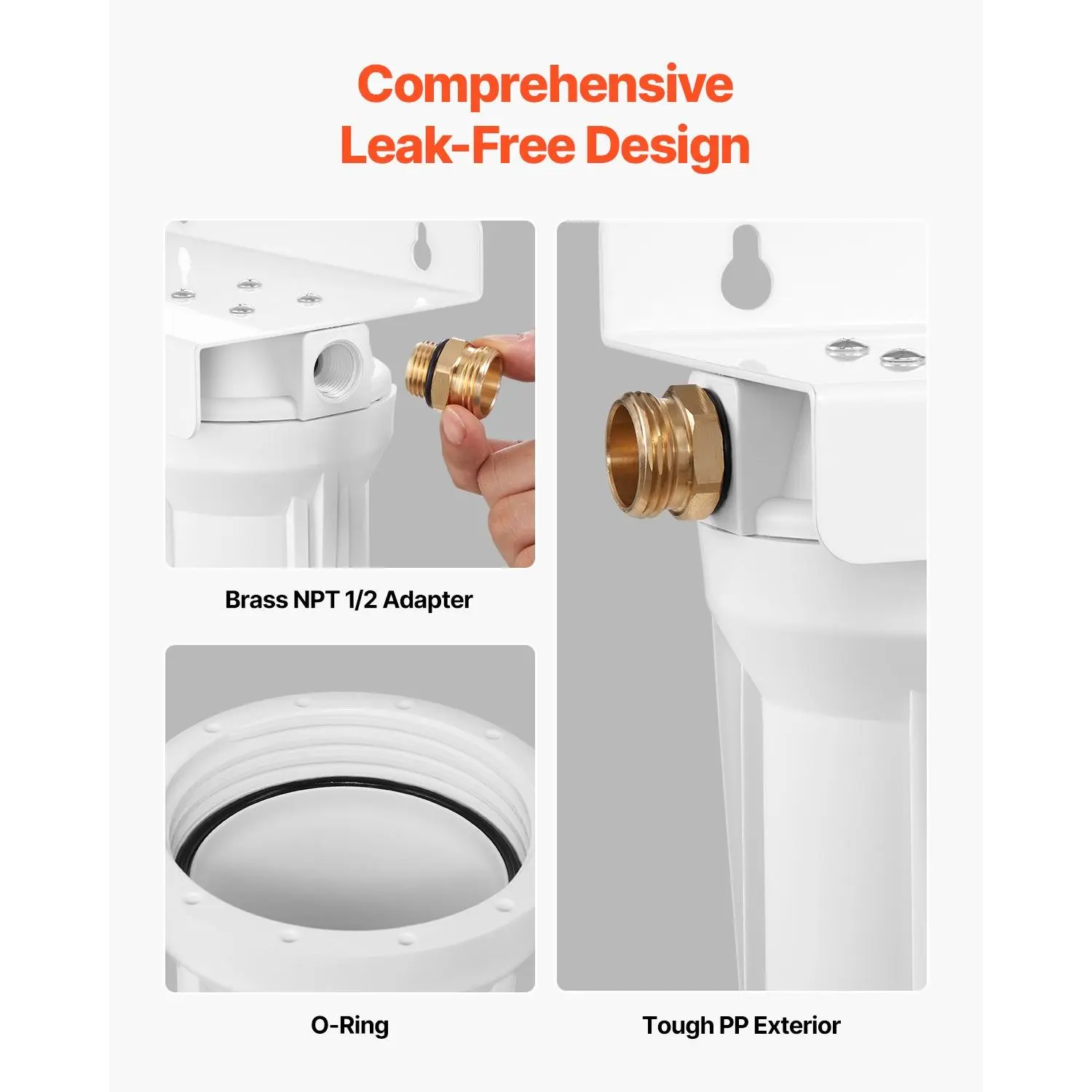 2-Cartridge Filtration: Use our two-cartridge (5-micron PP cotton, 5-micron CTO) RV water filtration system to remove impurities from tap water effectively.It traps sand, rust, sediment, adsorbs chlorine, chloramine, iron, manganese, lead, undesirable colors, and odors, providing safer and purer water for youExtended Lifespan: The RV filter system uses a 2.5 x 10 in filter cartridge, with a filtration flow rate of 2.9 GPM, capable of filtering 4,500 gallons of water without clogging.Ensures the cartridge maintains purification accuracy without overloading.To replace the cartridge, use the included wrenches to remove the filter housingLeak-Proof: The PP housing is freeze-resistant and impact-resistant.The filter housing features sealing rings that prevent water leakage, even in the bumpy environment of an RVYear-Round Use: The RV water filter system can be used all year round within a wide water temperature range of 4.4°C-40°C / 40°F-104°F, ensuring stable operation in both winter (above freezing) and hot summer conditionsConvenient to Use: Installation takes no more than 5 minutes, and it comes with a hanger to fix the filter on the RV.We offer a full set of accessories: a brass NPT 1/2" adapter compatible with most RVs, water pipes, and outdoor water systems, along with a flexible water hose and PTFE tape for easy connectionVEVOR RV Water Filtration System, 2-Cartridge Water Filter System for Campers, Remove Sediments, Chlorine, Bad Tastes, Odors, and Most Contaminants, RV Filter for RVs, Boats, Vans