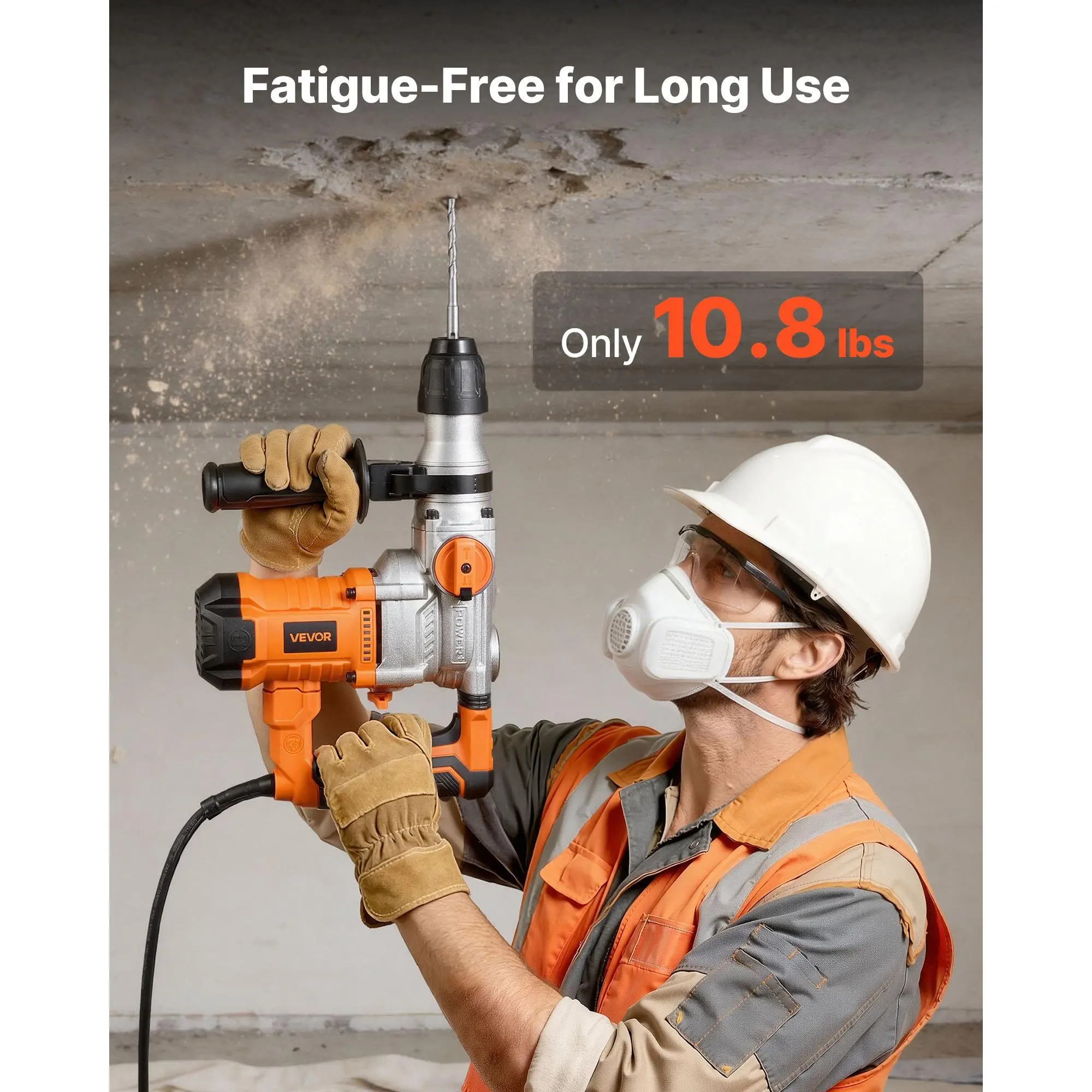 Easy Maintenance, Longer Tool Life: Simple grease refilling and brush replacement keep your rotary hammer drill running efficiently.Built with premium materials and enhanced cooling vents, it delivers extended service life2 Working Modes for Maximum Efficiency: Switch smoothly between hammer drilling and chiseling with one knob.This rotary hammer is ideal for drilling concrete or removing tiles and old coatings, making it suitable for renovation and demolition jobsSDS-Plus Chuck for Quick Bit Changes: The SDS-Plus system allows tool-free, secure bit changes in seconds.Compatible with various drill and chisel sizes, this SDS-Plus rotary hammer drill ensures efficient transitions between drilling and chiseling tasksErgonomic Handle for Total Control: The 360° adjustable side handle provides a flexible grip from any angle, improving stability and reducing fatigue during extended use.This corded rotary hammer drill is ideal for overhead or tight-space drillingEngineered for Durability and Comfort: Reinforced cooling vents improve heat dissipation, while internal damping reduces vibration for smoother control. Built to last, our hammer drill for concrete keeps your work stable and comfortable every timeVEVOR Rotary Hammer Drill, 1-1/8 in SDS-Plus Electric Corded Heavy Duty Rotary Hammer, Including 3 Drill Bits, Flat Chisel, Pointed Chisel, Grease, Brush, and Carrying Case, for Concrete and Masonry
