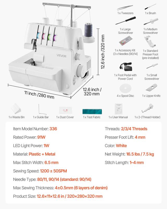 ·Upgraded Differential Feed: The well-designed 0.7–2.0 differential feed allows the overlock sewing machine to handle stretchy fabrics with ease, minimizing distortion and delivering smooth, professional-looking seams