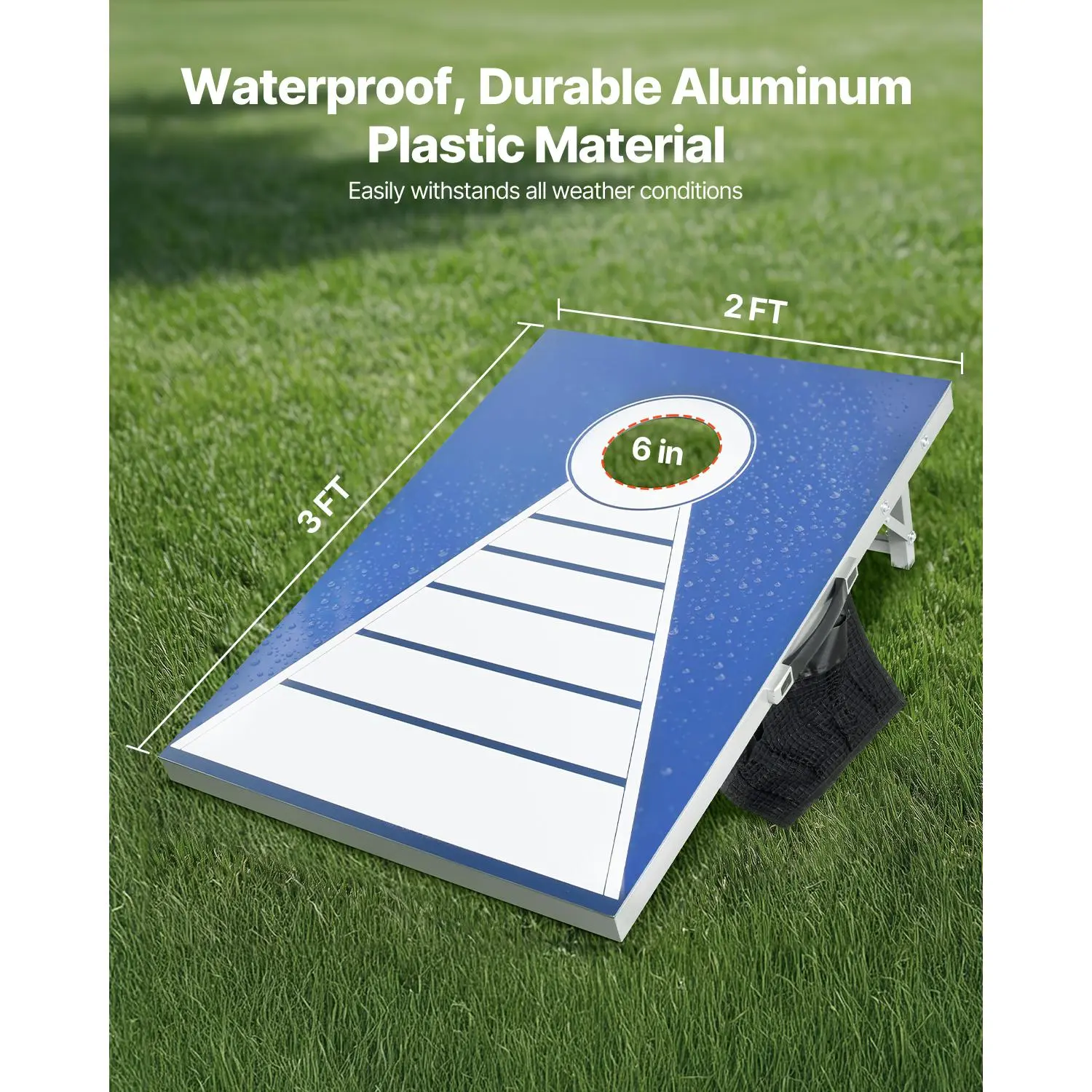 • Durable Material: The cornhole set is made of aluminum-plastic and welded steel frame. The board size is 3 x 2 ft, featuring an aluminum playing surface that ensures stability under all weather conditions, unaffected by rain, allowing you to enjoy endless fun with friends and family