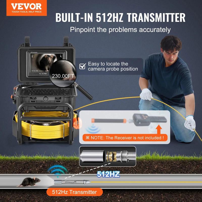 ·Precise Locating & Distance Display: Our 230FT sewer camera has a built-in 512Hz sonde transmitter for accurate location tracking. An on-screen distance counter measures the length of the cable in the sewer, enabling you to quickly locate problems when used with the locator (not included). Compatible Pipe Diameters: Straight Pipes: Φ 0.99 - 5.90 in / 25 - 150 mm; Right Angle Pipes: Φ 1.97 - 5.90 in / 50 - 150 mm.