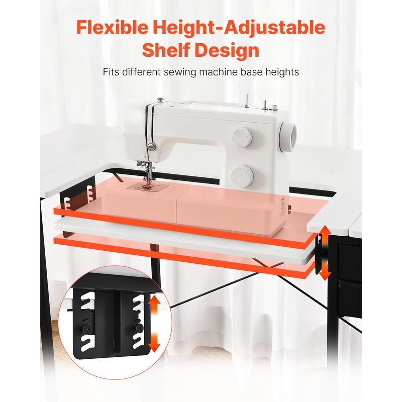 • Flexible Height Adjustment: Equipped with a height-adjustable shelf, our sewing desk fits sewing machine bases of different heights. It also serves as a platform for laptops or keyboards, adjusting the shelf height for stable sewing machine placement