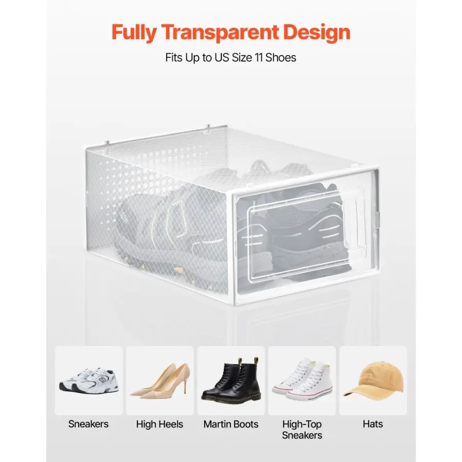 The convenient handle makes organization easy. These spacious shoe organizer boxes fit up to US Size 11 shoes and feature water-proof and dust-proof designs, providing maximum care for your favorite footwear.