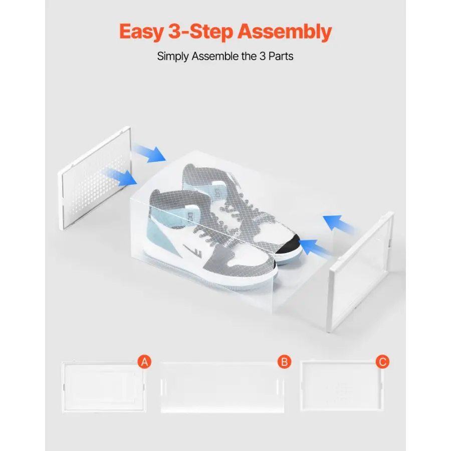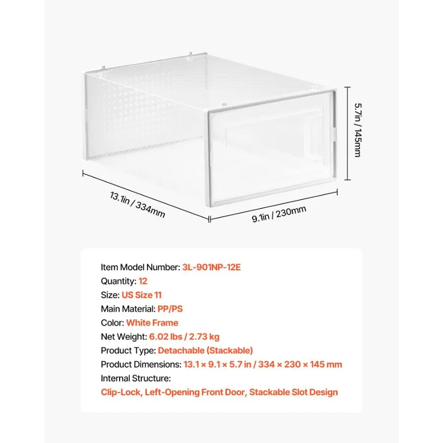 VEVOR Shoe Storage Boxes, 12 Pack Stackable Shoe Boxes Storage Organizers, Fit up to US Size 11, Plastic Modular Space Saving Sneaker Containers for Storing High Heels, Boots, and Hats, White Frame