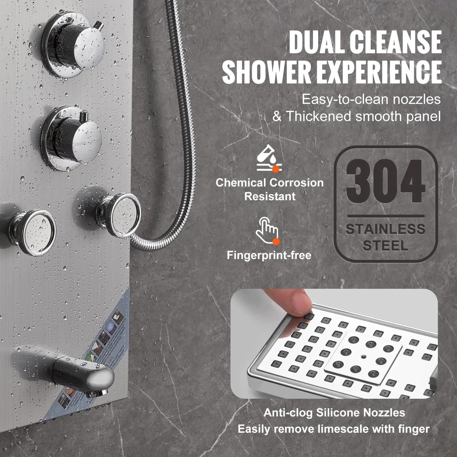 • Anti-Clog Nozzles & 304 Stainless Steel: Our shower tower system features 4 angle-adjustable massage jets, a large area spray massage jet and a 3-setting shower head to accommodate users of all heights, including children. Featuring silicone nozzles for easy blockage removal and prevention of scale buildup. Crafted from high-quality 304 stainless steel, our panel is resistant to fingerprints, rust, and corrosion, ensuring lasting beauty and hygiene.