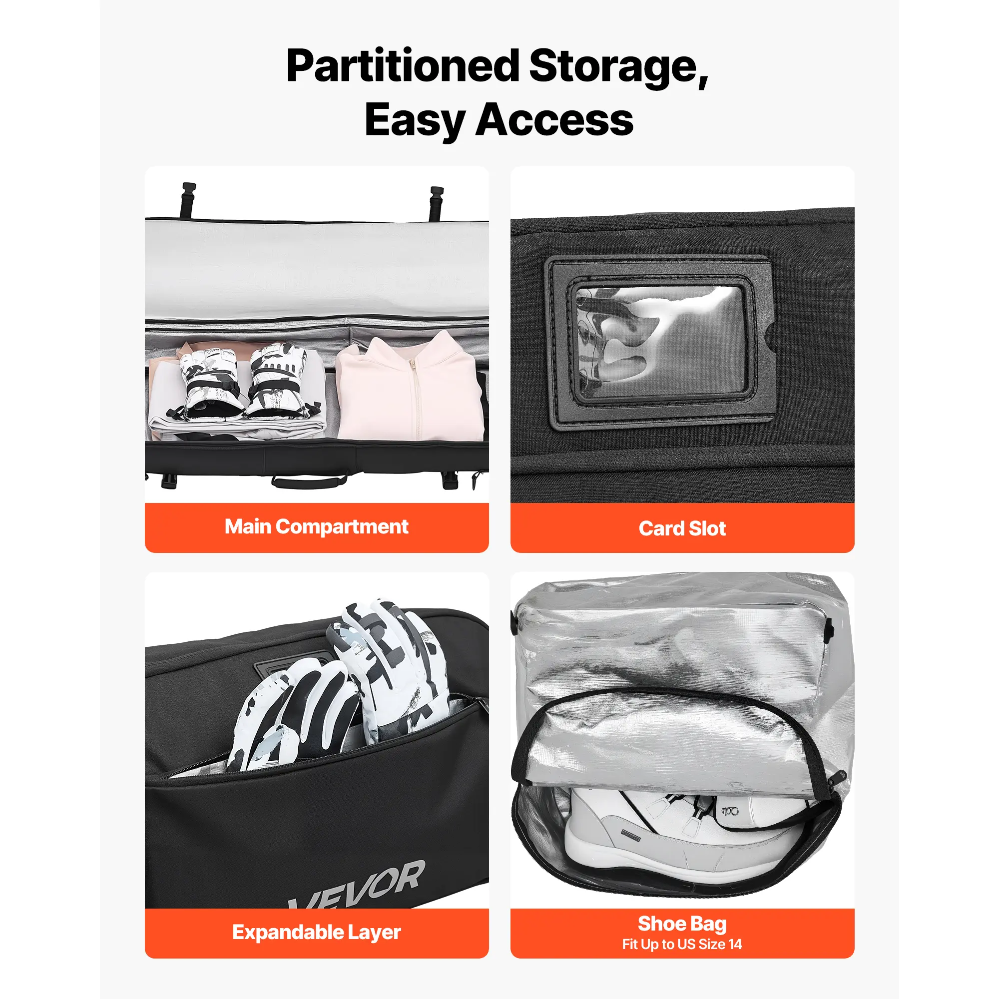 Holds snowboards up to 68.9 in (175 cm) with a 10 cm (4 in) extension. Our ski roller bag provides ample space to store and safeguard your gear. Perfect for skis, poles, goggles, gloves, helmets, and boots.