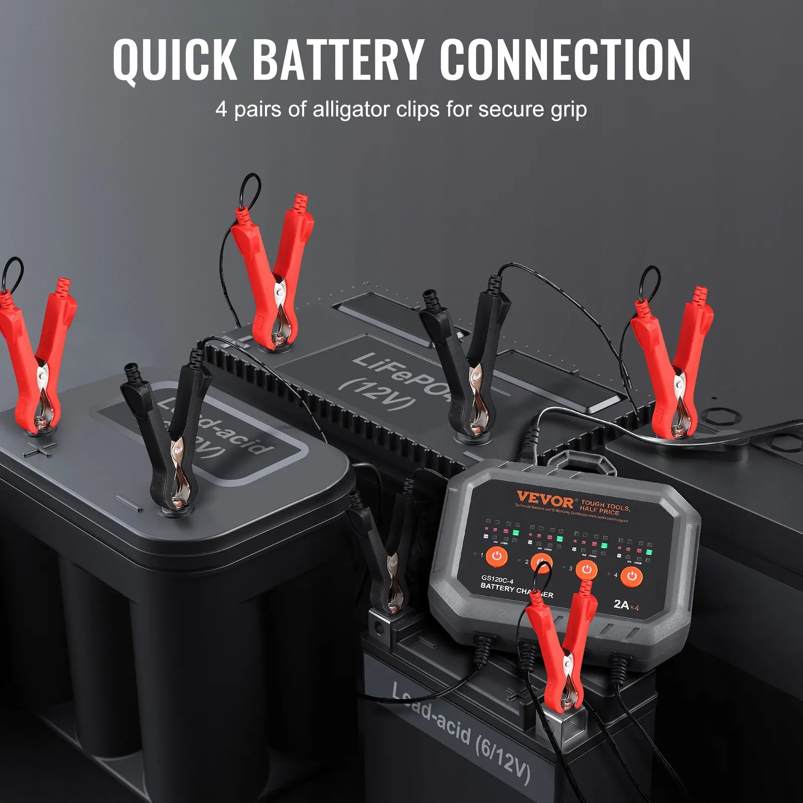Introducing our car battery charger, compatible with 6V/12V lead-acid and LiFePO4 batteries. It combines a battery charger, battery maintainer, and battery desulfator in a single unit. It can charge four sets of batteries simultaneously, covering all your needs!