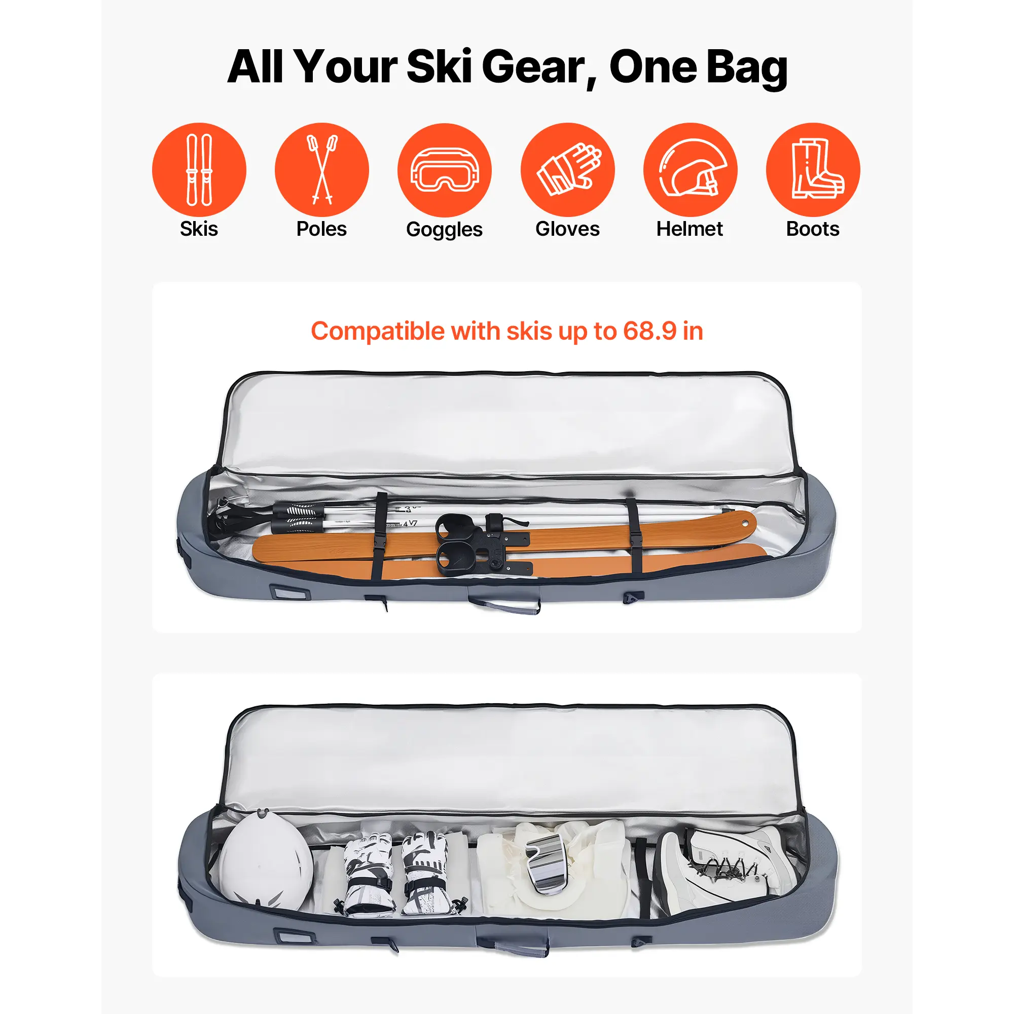 • Spacious Storage: This bag comfortably fits snowboards up to 65 in (165 cm) and holds boots, helmets, gloves, poles, and more. It provides ample space for all your gear, ensuring everything is safely stored and protected. Perfect for air travel, it keeps your equipment organized and secure.