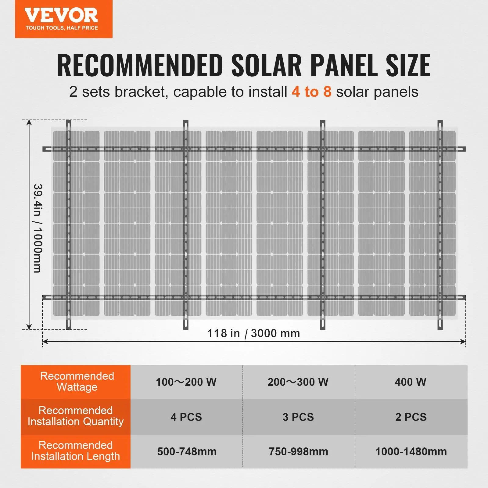 • Versatile Applicability: VEVOR 2 sets multi-piece solar panel mounting brackets support the installation of 4 to 8PCS solar panels. Single Bracket Recommended Installation Sizes: 4 panels (19.7 - 29.5 inch; 100W - 200W), 3 panels (29.5 - 39.3 inch; 200W - 300W), and 2 panels (39.4 - 58.3 inch; 400W).
