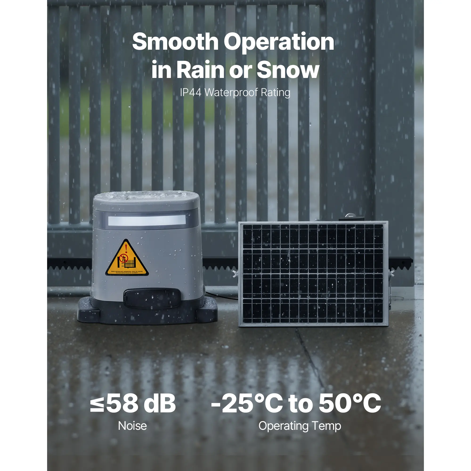 • Durable Design for Harsh Environments: Made with a cast aluminum and ABS shell, this sliding gate opener is durable and resistant to damage. The nylon gear rack offers strong impact resistance, while the stainless steel gears are highly corrosion-resistant, durable, and strong. With an IP44 rating for water and dust resistance, it performs reliably in all weather conditions.